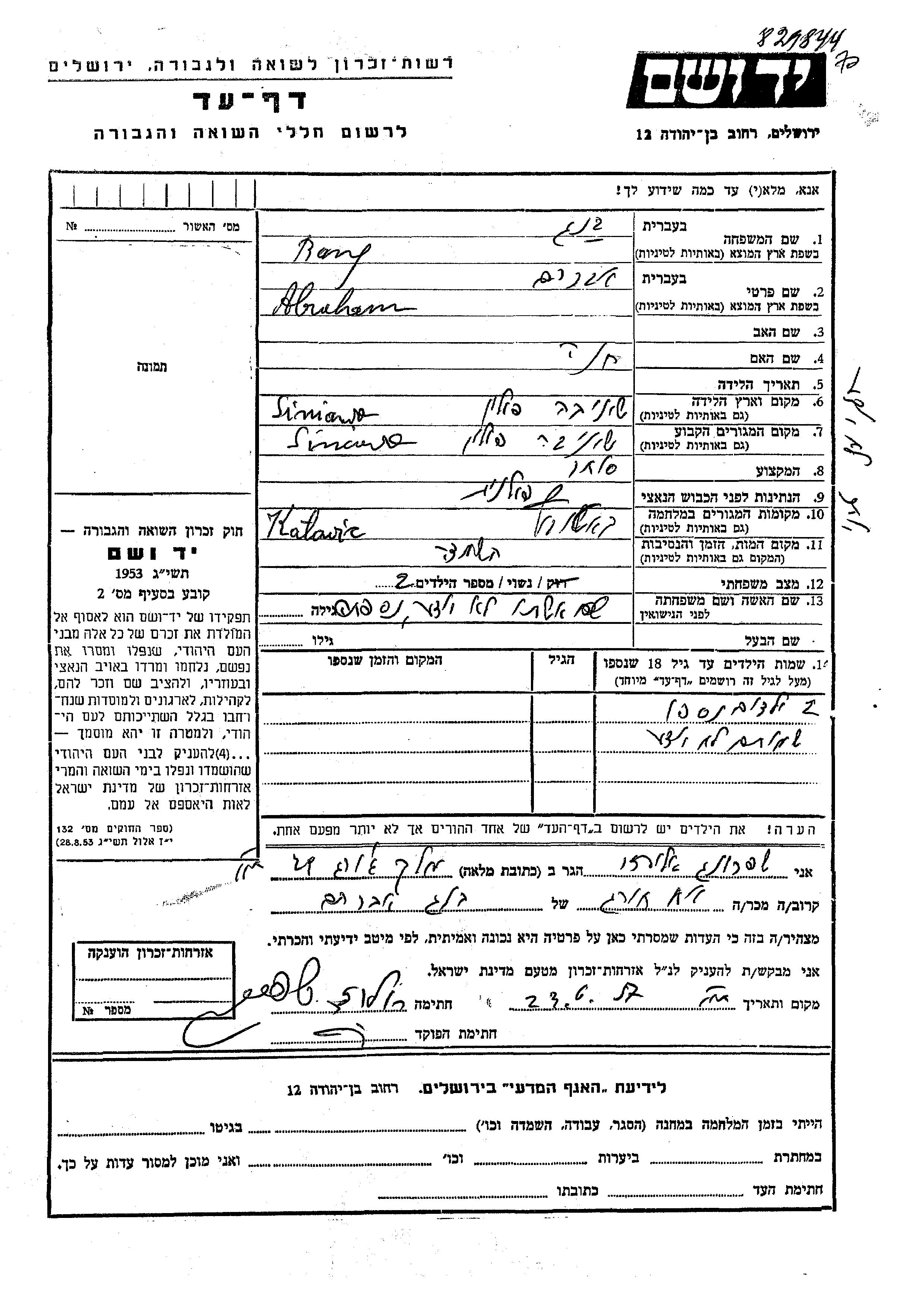 Abraham Bang wurde in Siniawa, Polen geboren. Er war der Sohn von Khana. Er war Kaufmann/-frau und Verheiratet. Vor dem Zweiten Weltkrieg lebte er in Siniawa, Polen. Während des Krieges war er in Katowice, Polen.