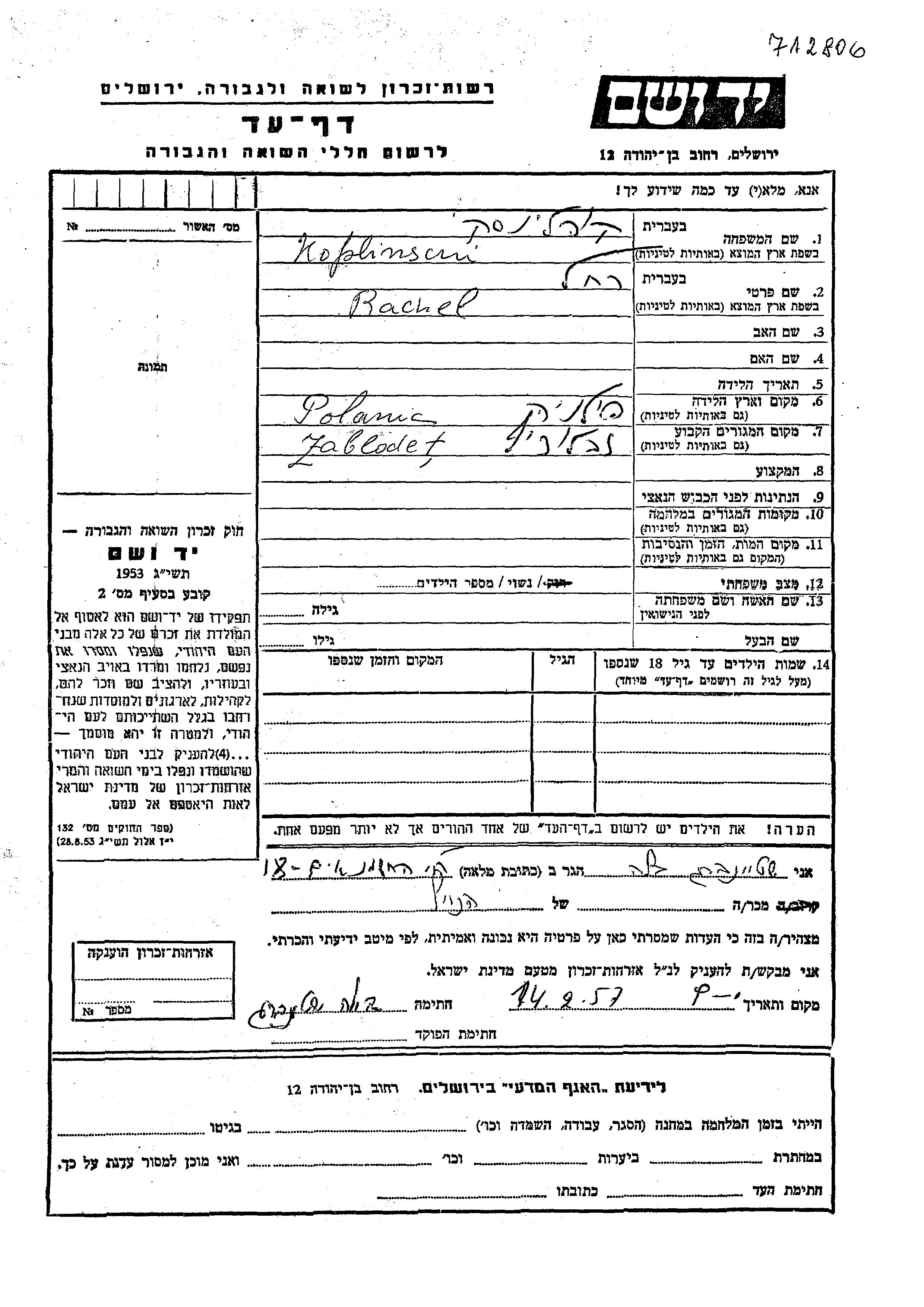Koplinscki Rachel Zabludow, Polen Gedenkblatt