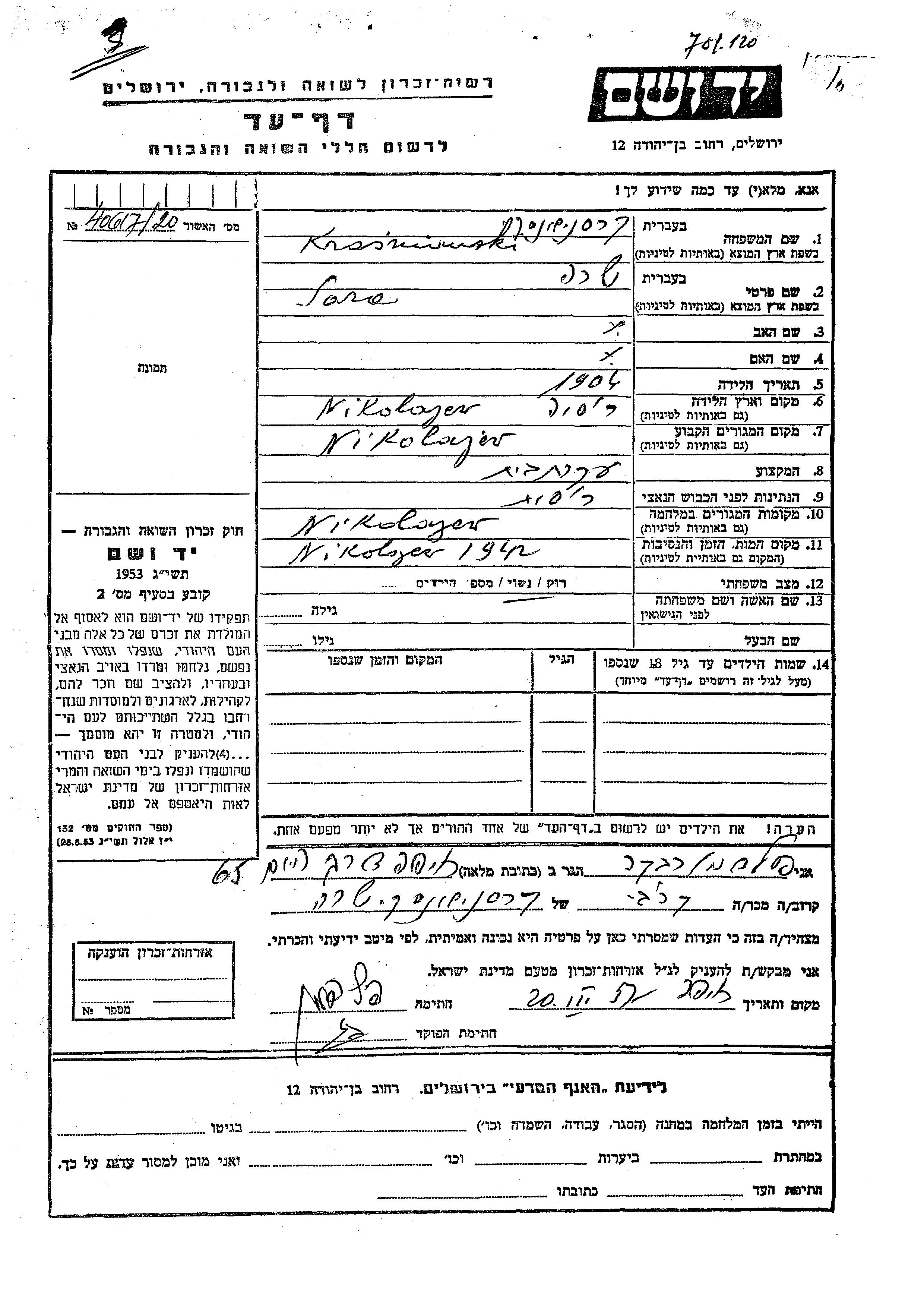 Sara Krasnianski wurde im Jahr 1904 in Nikolaev, Ukraine (UdSSR) geboren. Sie war Hausfrau und Verheiratet. Vor dem Zweiten Weltkrieg lebte sie in Nikolaev, Ukraine (UdSSR). Während des Krieges war sie in Nikolaev, Ukraine (UdSSR).
