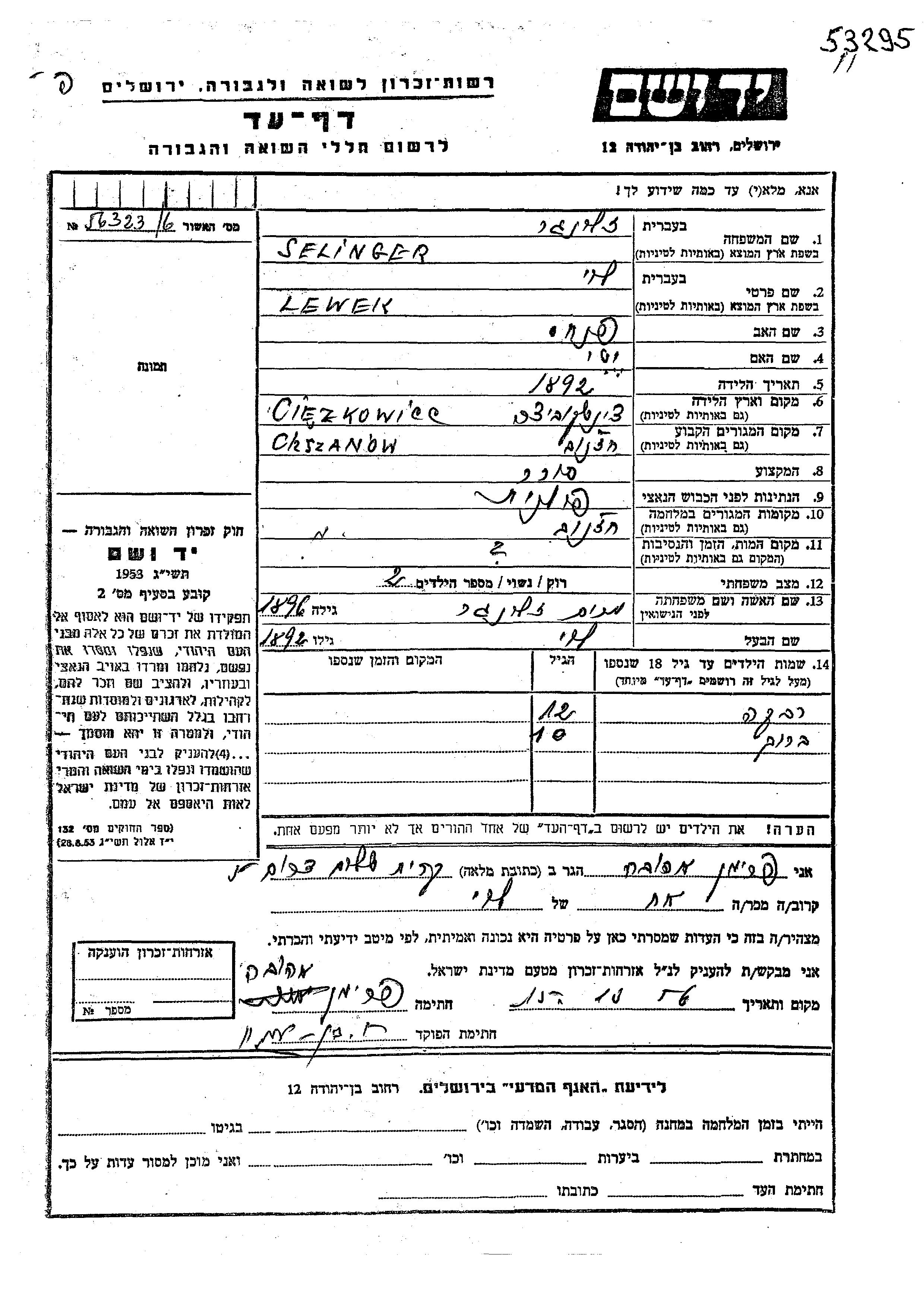 Lewek Levi Selinger wurde im Jahr 1892 in Ciezkowice, Polen geboren. Er war der Sohn von Pinkhas und Yehudit. Er war Kaufmann/-frau und mit Miriam Verheiratet. Vor dem Zweiten Weltkrieg lebte er in Chszanow, Polen. Während des Krieges war er in Chszanow, Polen.