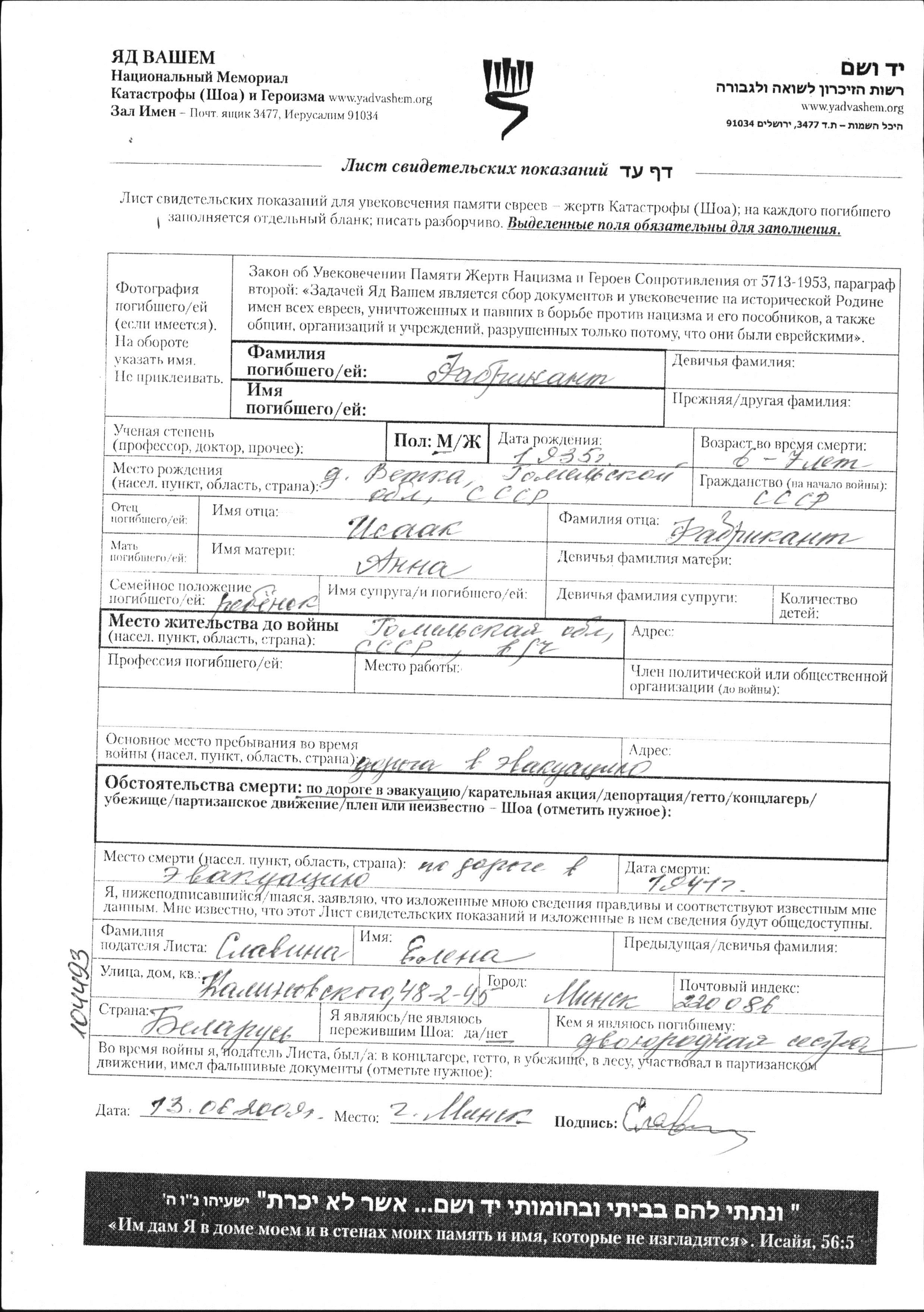 Vorname unbekannt Fabrikant wurde im Jahr 1935 in Vetka, Weißrussland (UdSSR) geboren. Er war der Sohn von Isaak und Anna. Er war Kind. Vor dem Zweiten Weltkrieg lebte er in Gomel, Weißrussland (UdSSR).