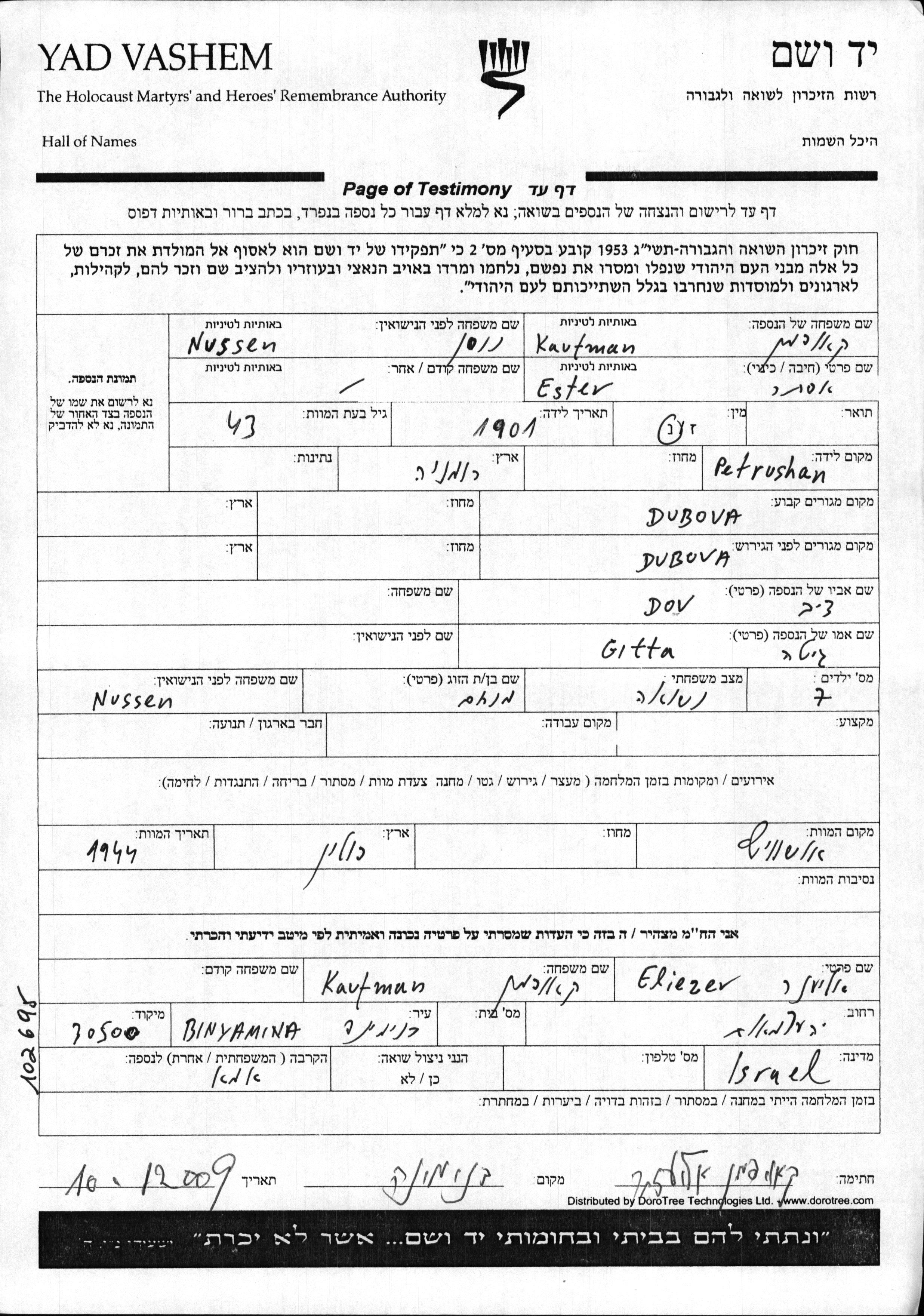 Ester Kaufman, geb. Nussen wurde im Jahr 1901 in Petrushany, Rumänien geboren. Sie war die Tochter von Dov und Gitta. Sie war mit Menakhem Verheiratet. Vor dem Zweiten Weltkrieg lebte sie in Dubova, Tschechoslowakei. Während des Krieges war sie in Dubova, Tschechoslowakei.