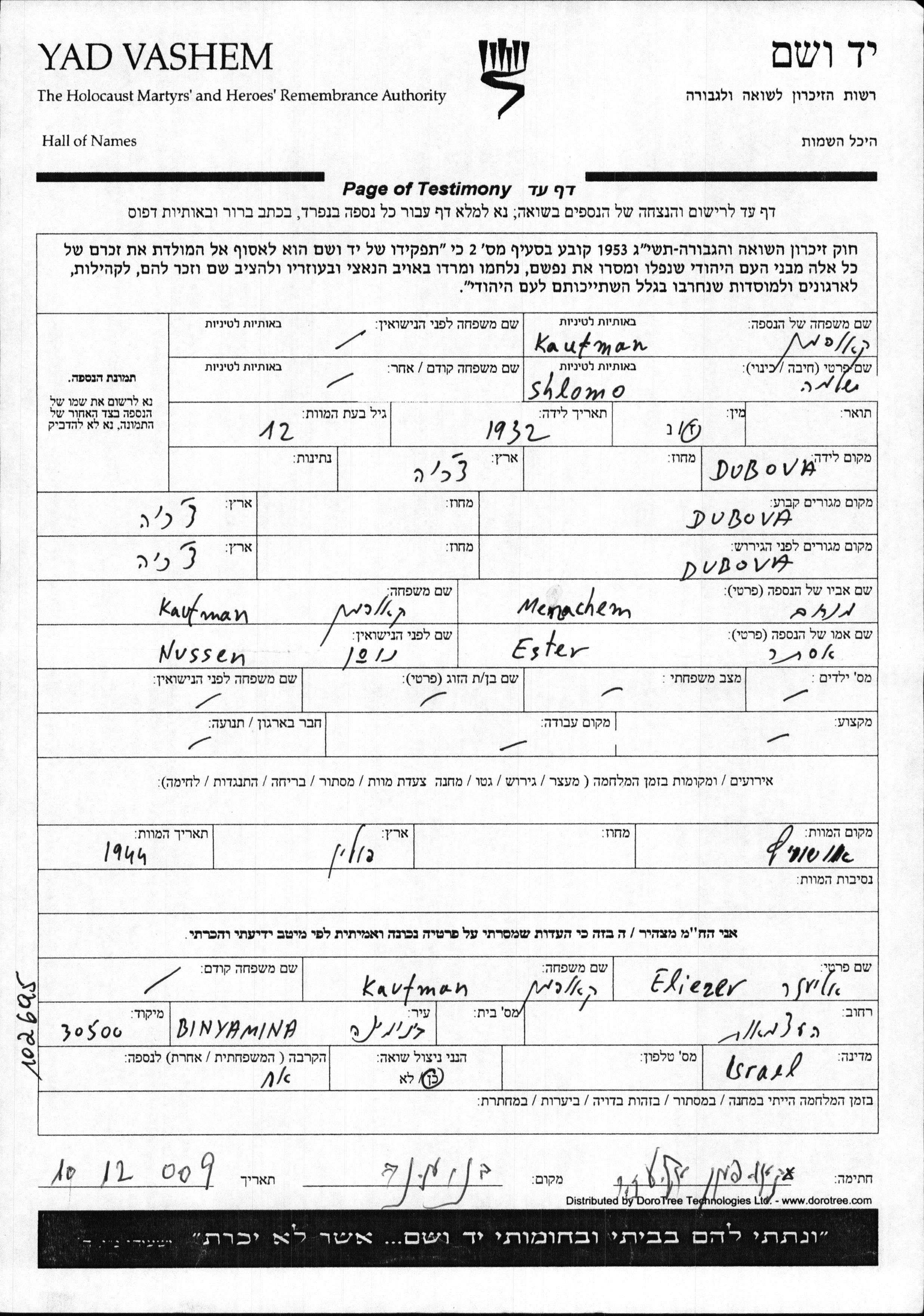 Shlomo Kaufman wurde im Jahr 1932 in Dubova, Tschechoslowakei geboren. Er war der Sohn von Menachem und Ester, geb. Nussen. Er war Kind. Vor dem Zweiten Weltkrieg lebte er in Dubova, Tschechoslowakei. Während des Krieges war er in Dubova, Tschechoslowakei.