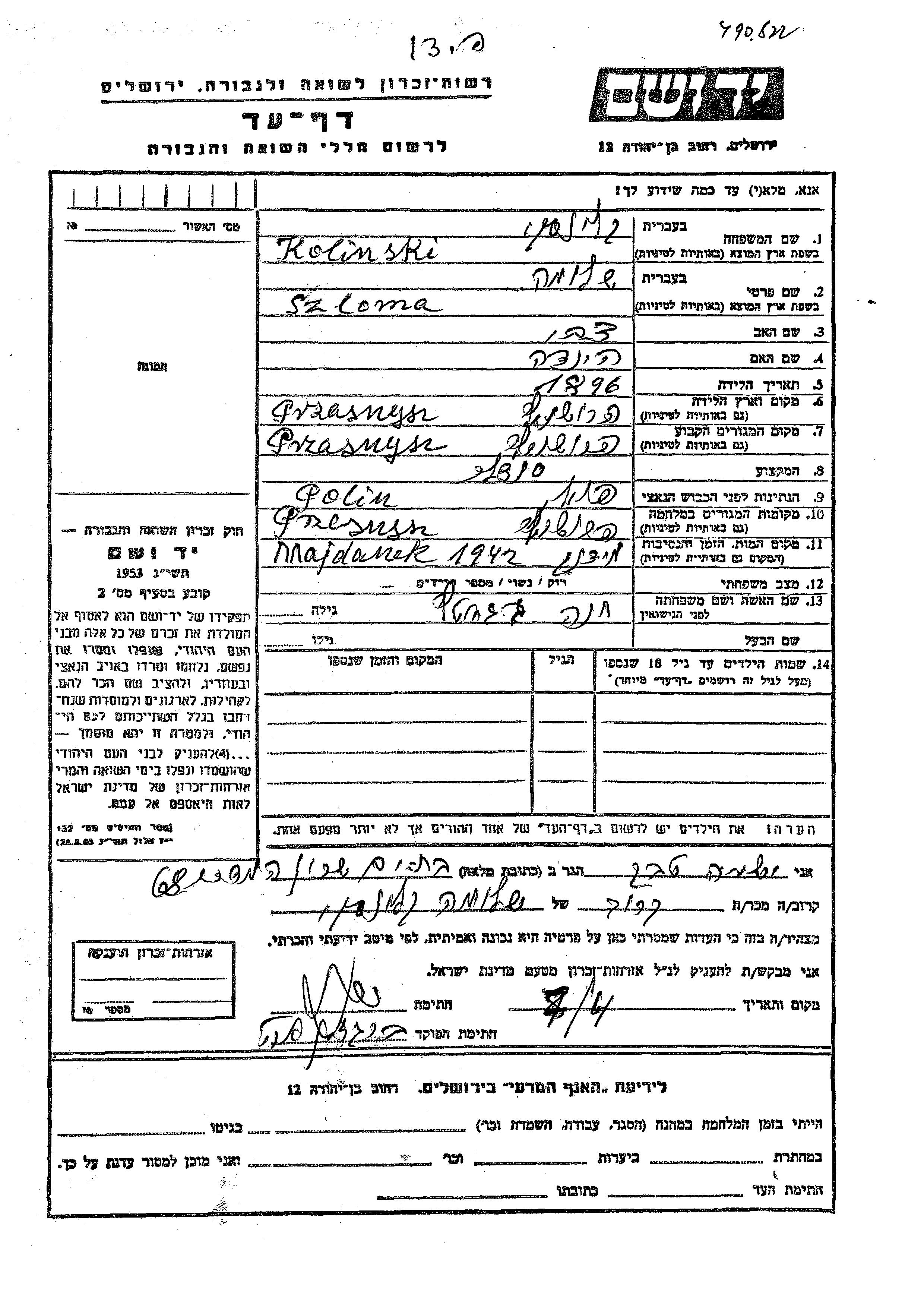 Szloma wurde in der Schoah ermordet. Todesort: Majdanek, Polen im Jahr 1942.