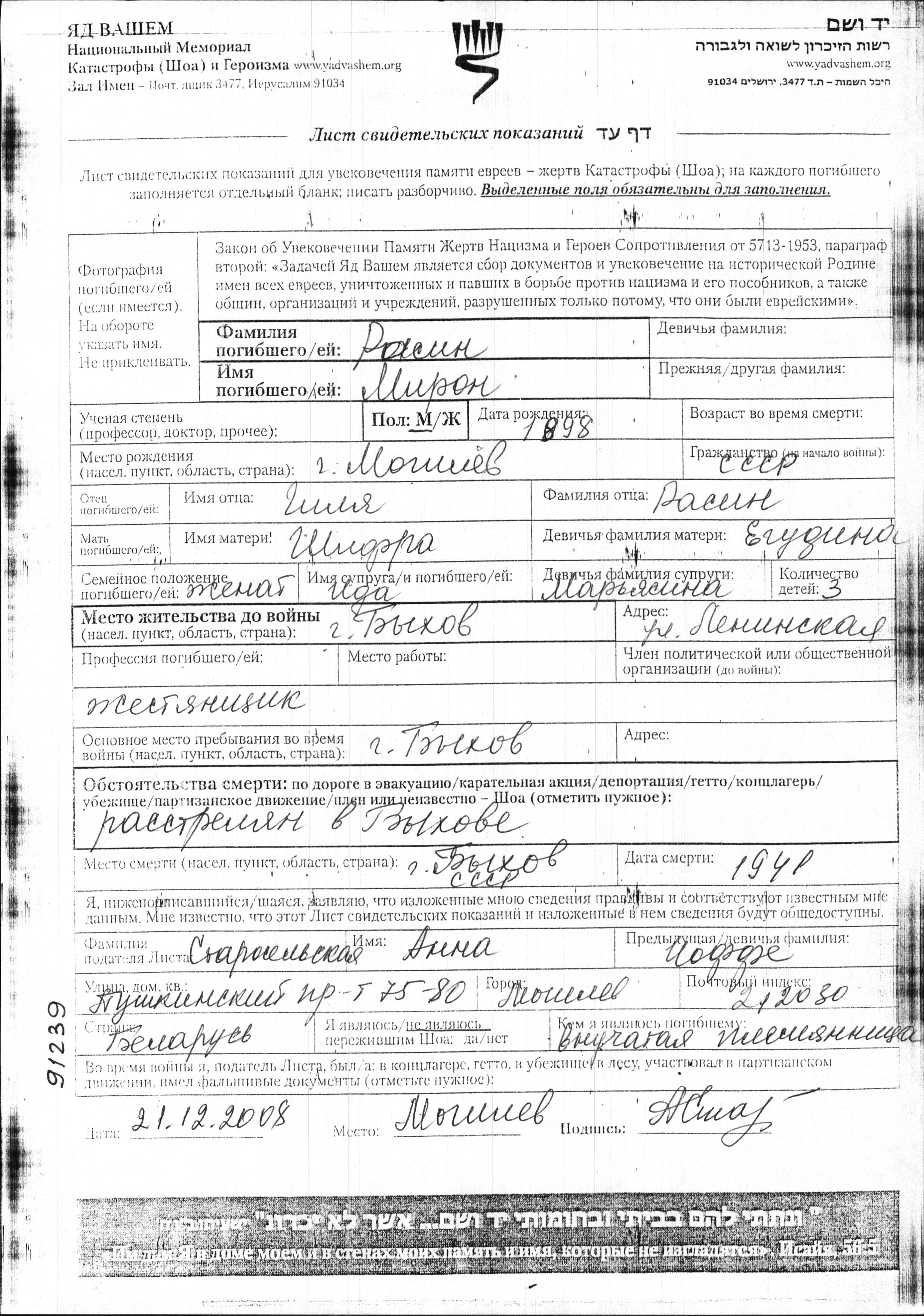 Miron Rasin wurde im Jahr 1898 in Mogilev, Weißrussland (UdSSR) geboren. Er war der Sohn von Gilya und Shifra, geb. Yegudina. Er war Blechschmied und mit Ida, geb. Maryasina Verheiratet. Vor dem Zweiten Weltkrieg lebte er in Bykhov, Weißrussland (UdSSR). Während des Krieges war er in Bykhov, Weißrussland (UdSSR).