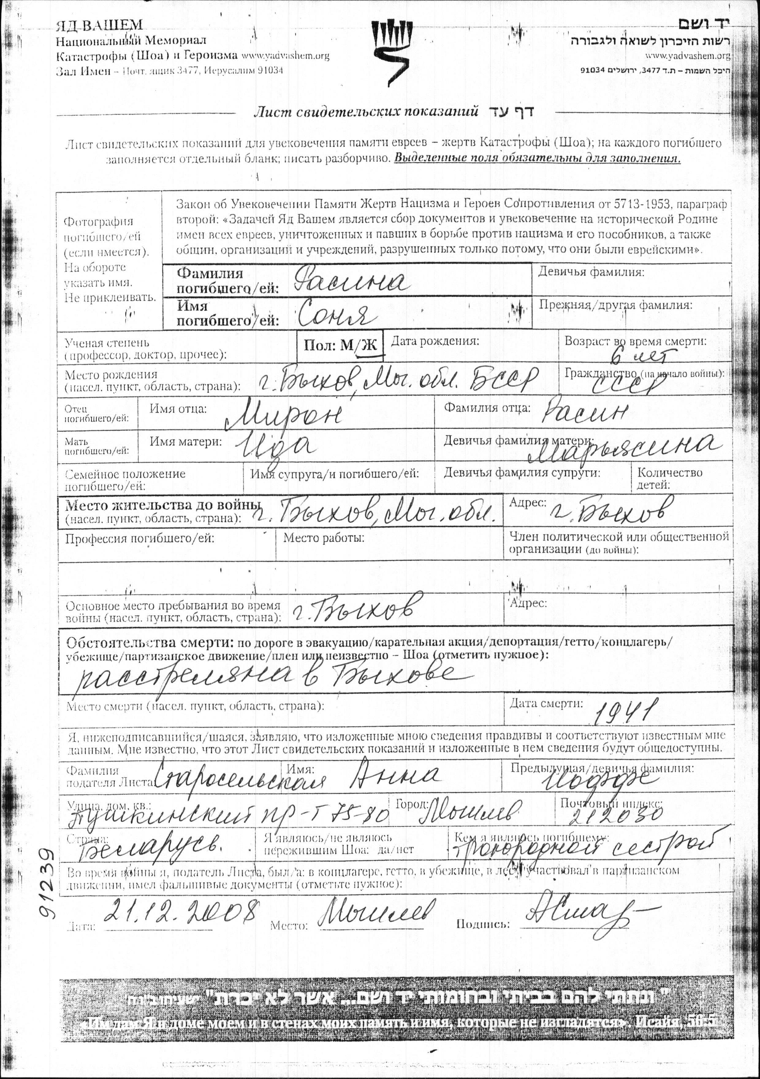 Sonya wurde in der Schoah ermordet. Todesort: Bykhov, Weißrussland (UdSSR) im Jahr 1941.