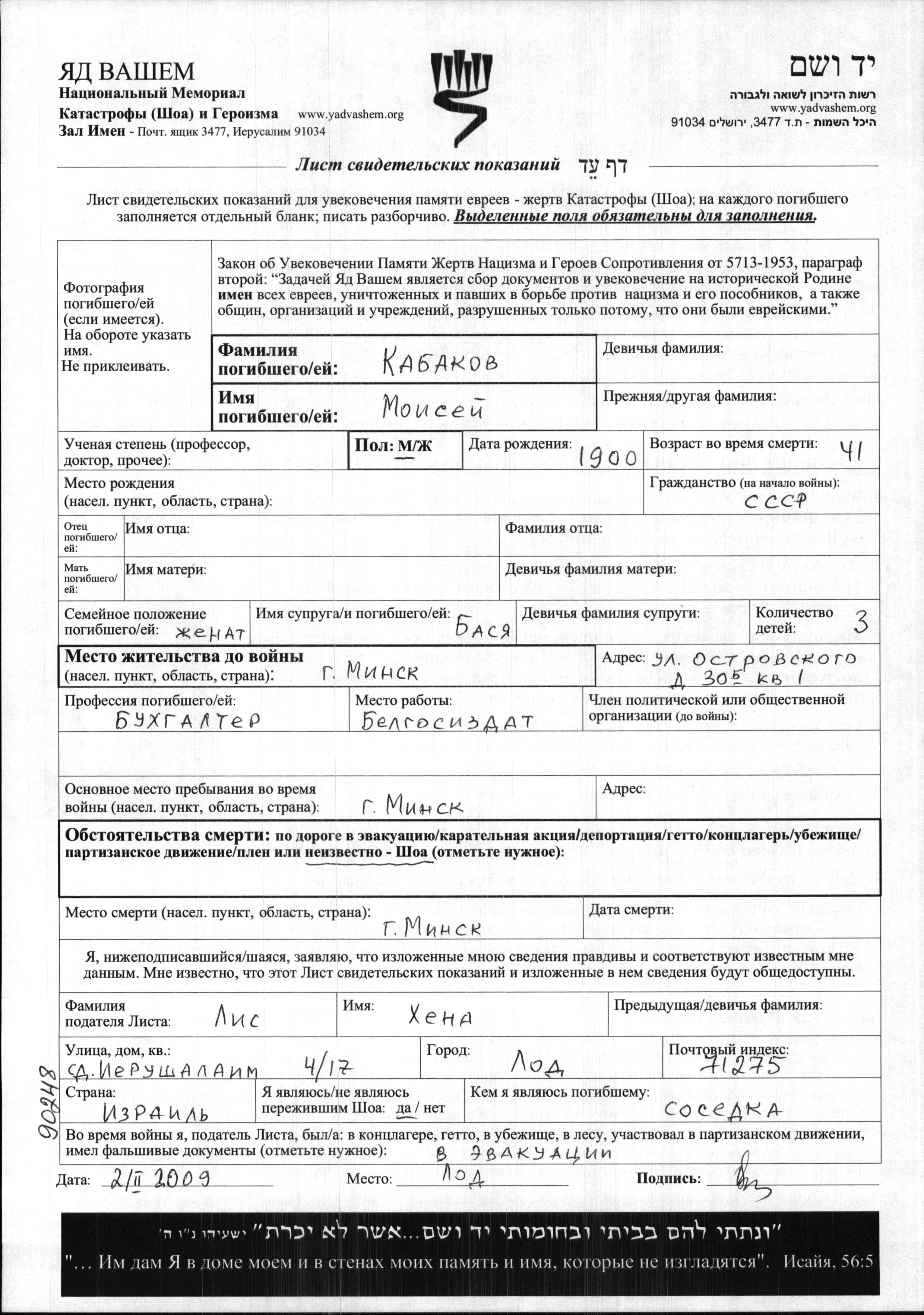 Moisei Kabakov wurde im Jahr 1900 geboren. Er war Buchhalter/-in und mit Basya Verheiratet. Vor dem Zweiten Weltkrieg lebte er in Minsk, Weißrussland (UdSSR). Während des Krieges war er in Minsk, Weißrussland (UdSSR).