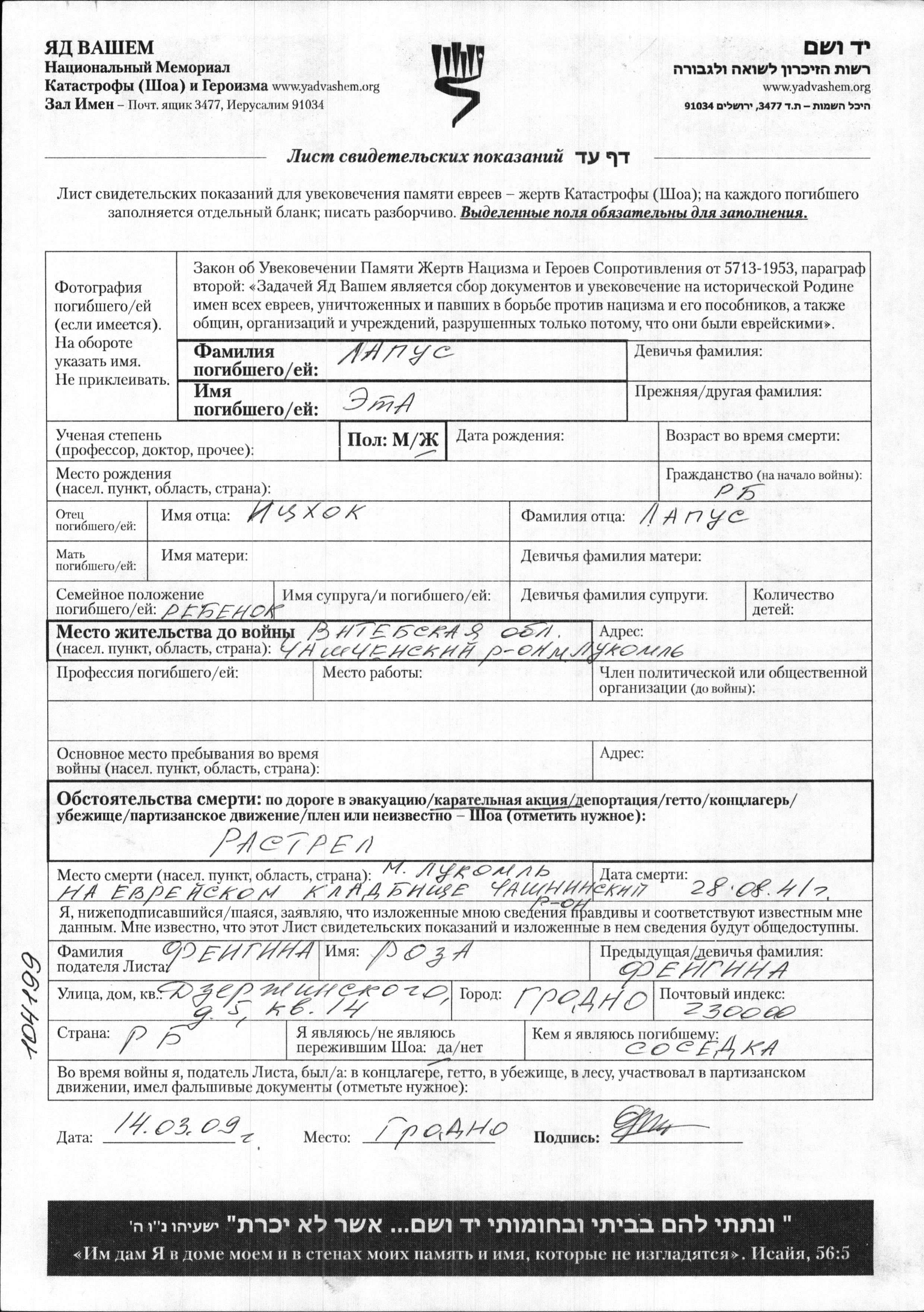 Eta wurde in der Schoah ermordet. Todesort: Lukoml, Weißrussland (UdSSR) im Jahr 28/08/1941.
