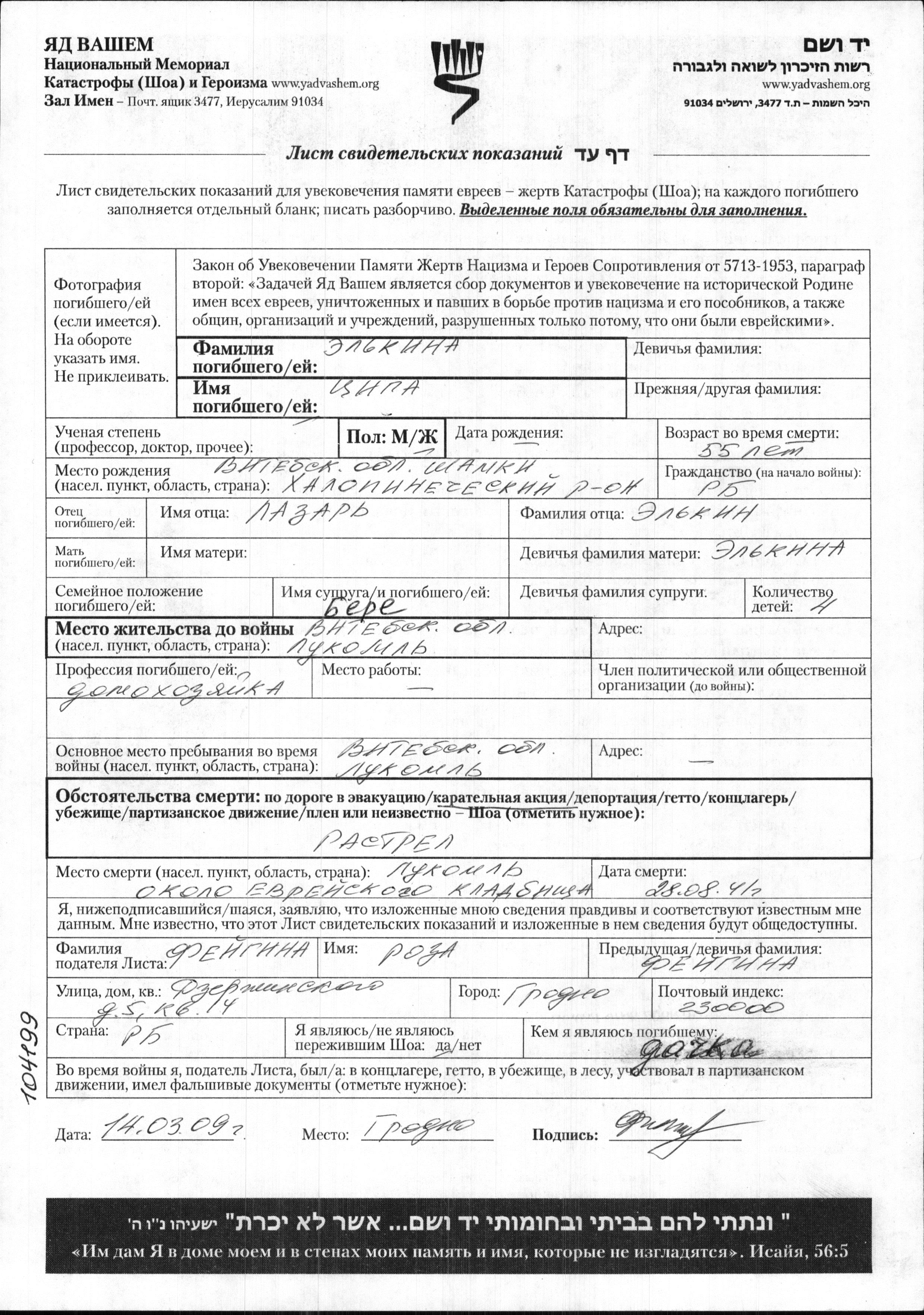 Tzipa Elkina wurde in Shamki, Weißrussland (UdSSR) geboren. Sie war die Tochter von Lazar. Sie war Hausfrau und mit Bere, geb. Elkina Verheiratet. Vor dem Zweiten Weltkrieg lebte sie in Lukoml, Weißrussland (UdSSR). Während des Krieges war sie in Lukoml, Weißrussland (UdSSR).