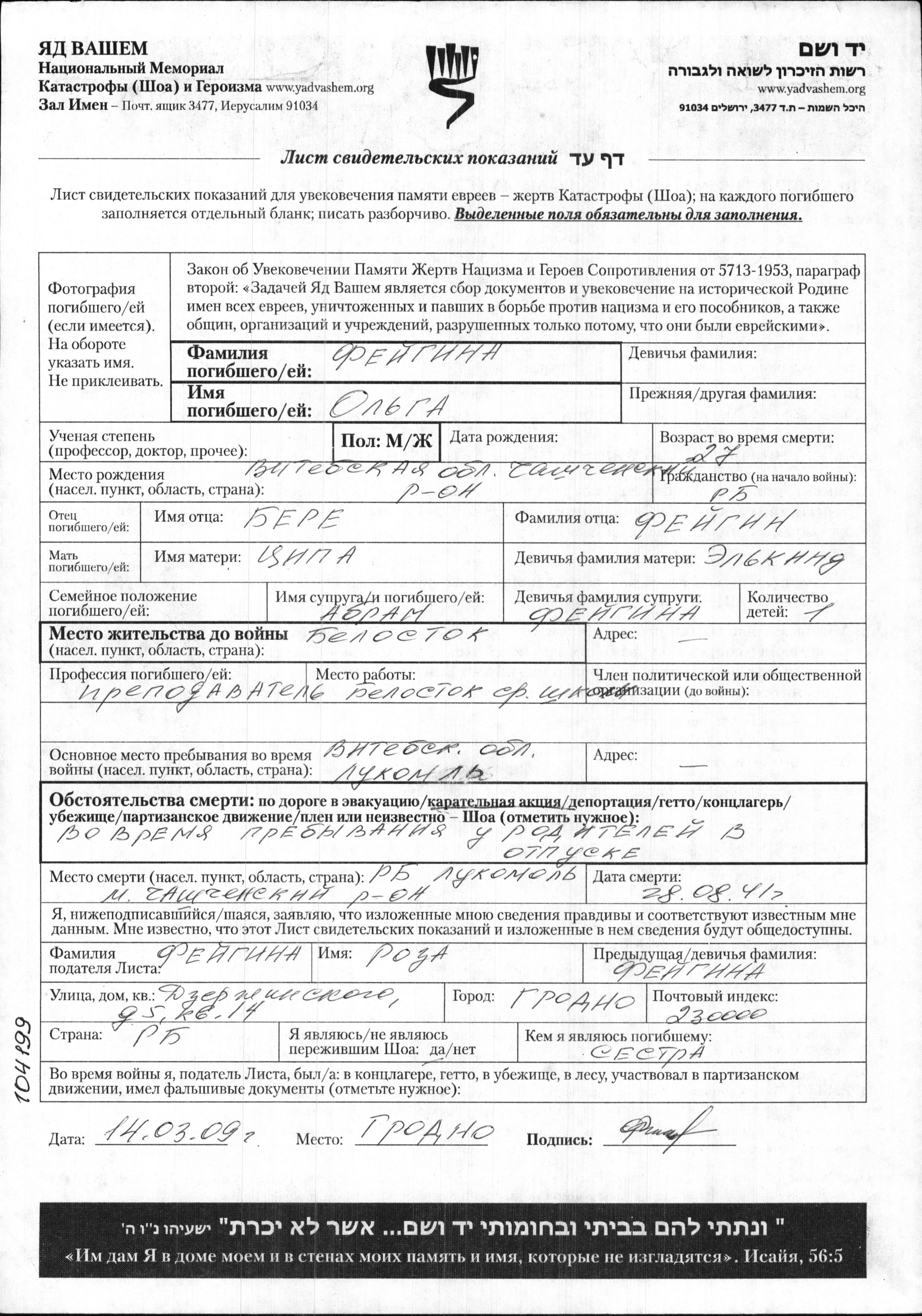 Olga Feygina wurde in Chashniki, Weißrussland (UdSSR) geboren. Sie war die Tochter von Bere und Tzipa, geb. Elkind. Sie war Prepodavatel v shkole und mit Abram Verheiratet. Vor dem Zweiten Weltkrieg lebte sie in Belostok, Polen. Während des Krieges war sie in Lukoml, Weißrussland (UdSSR).