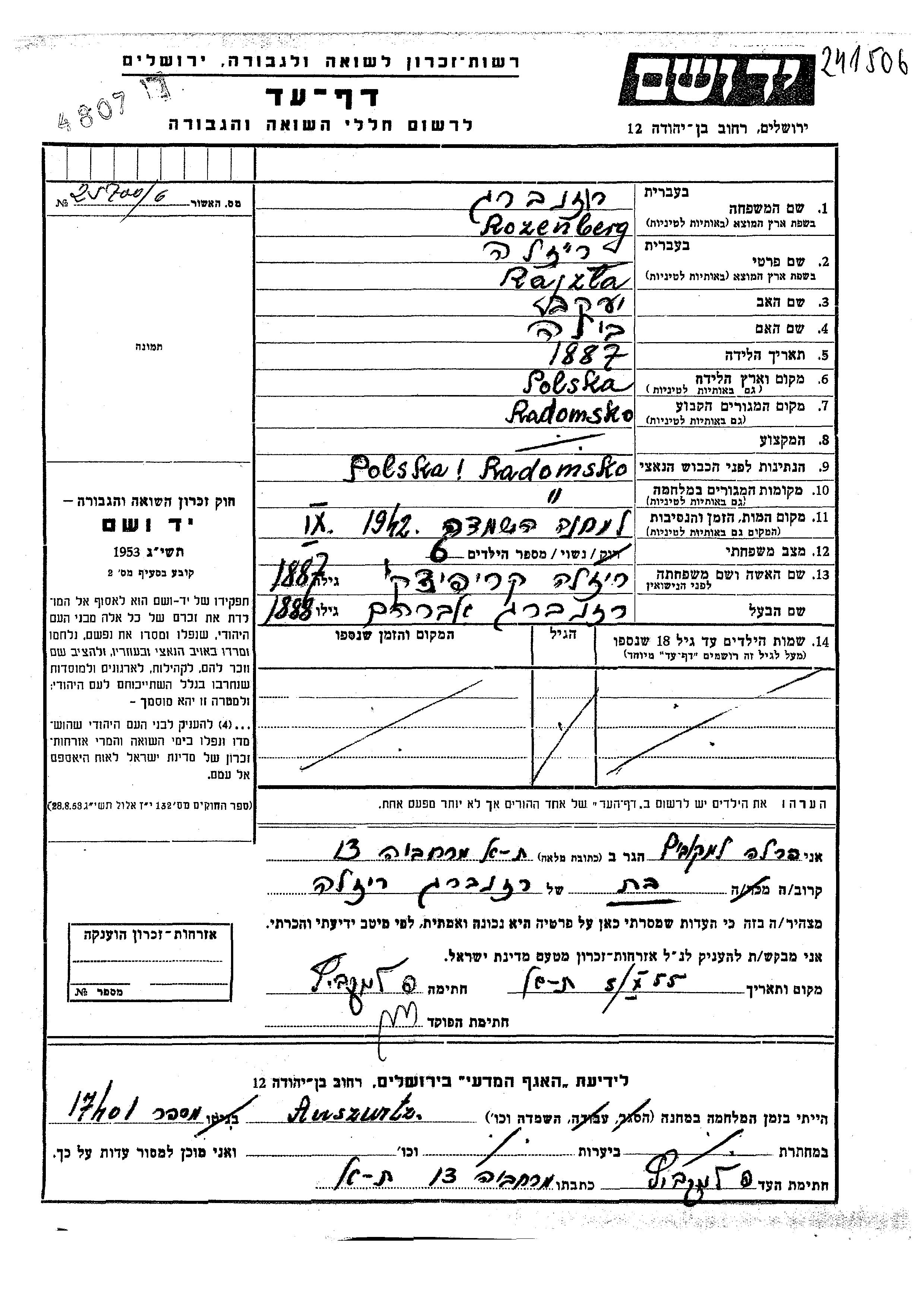 Rajzla Rozenberg, geb. Kripitzki wurde im Jahr 1887 in Polen geboren. Sie war die Tochter von Yaakov und Bila. Sie war mit Avraham Verheiratet. Vor dem Zweiten Weltkrieg lebte sie in Radomsko, Polen. Während des Krieges war sie in Radomsko, Polen.