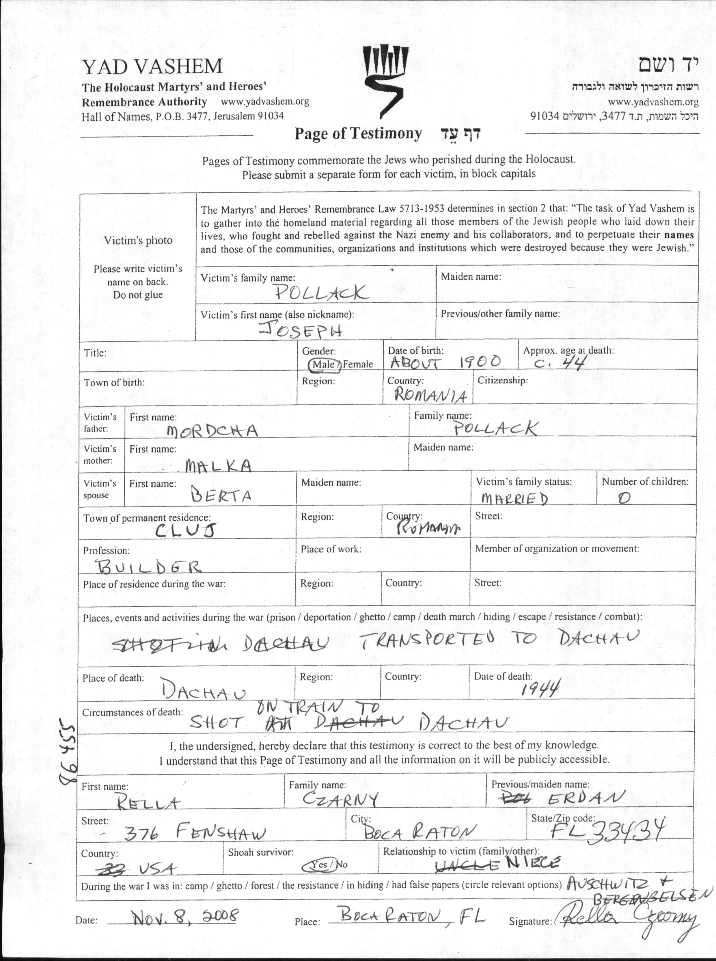 Joseph Pollack wurde im Jahr 1900 in Rumänien geboren. Er war der Sohn von Mordcha und Malka. Er war Bauarbeiter und mit Berta Verheiratet. Vor dem Zweiten Weltkrieg lebte er in Cluj, Rumänien.