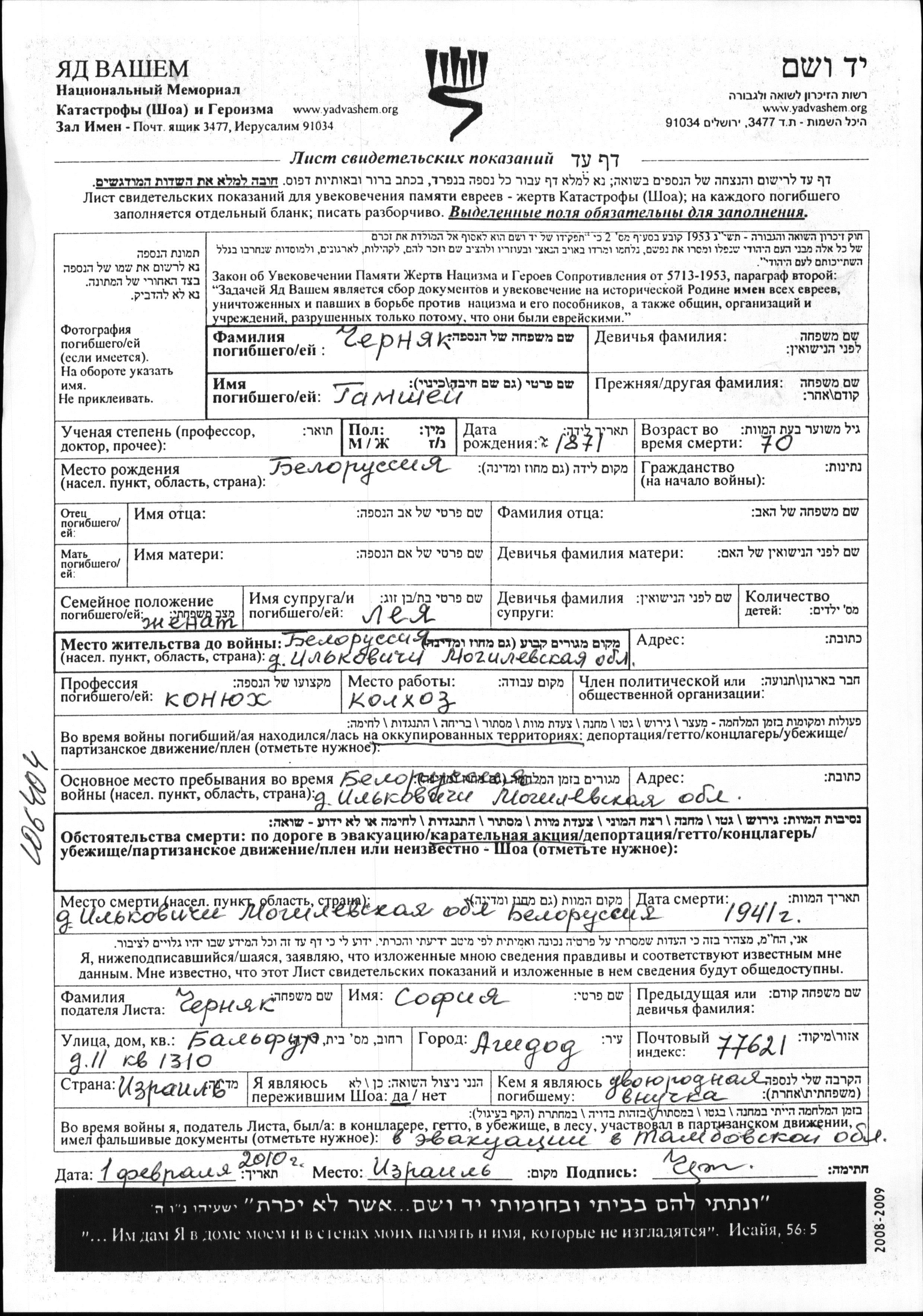 Gamshey Chernyak wurde im Jahr 1871 in Weißrussland (UdSSR) geboren. Er war Pferdeknecht und mit Leya Verheiratet. Vor dem Zweiten Weltkrieg lebte er in Ilkovichi, Weißrussland (UdSSR). Während des Krieges war er in Ilkovichi, Weißrussland (UdSSR).