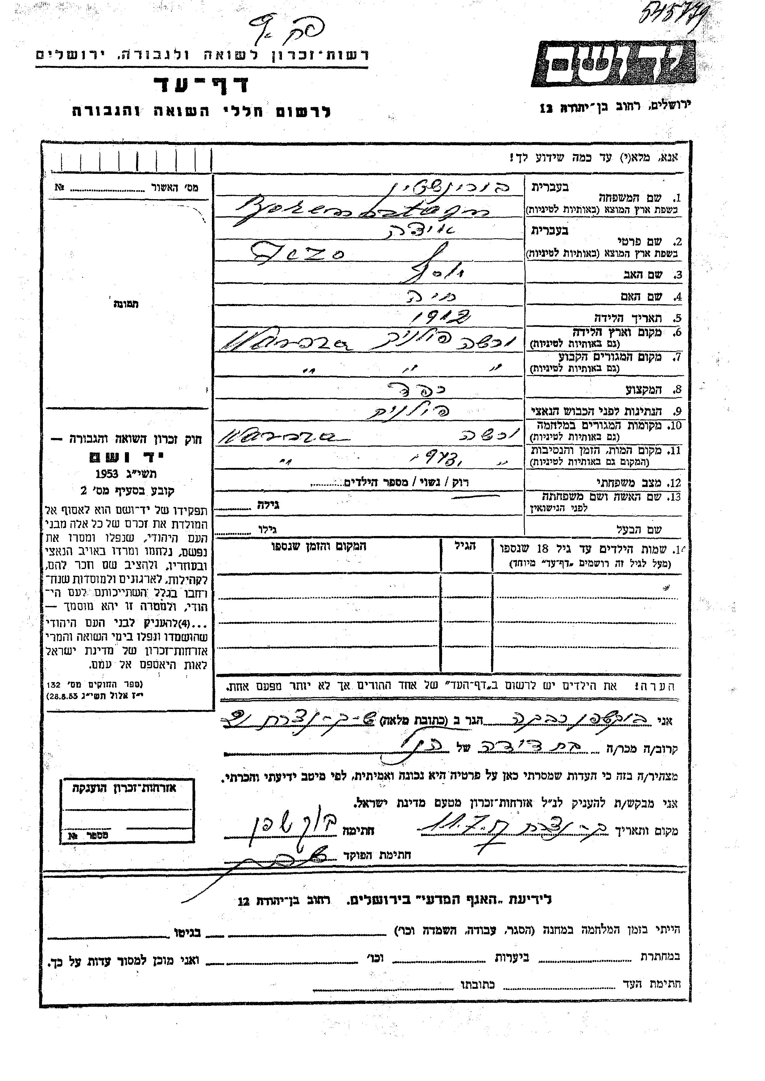 Jezo Borensztajn Burinshtein wurde im Jahr 1912 in Warsaw, Polen geboren. Er war der Sohn von Yosef und Khaia. Er war Polsterer/-in und Ledig. Vor dem Zweiten Weltkrieg lebte er in Warsaw, Polen. Während des Krieges war er in Warsaw, Polen.