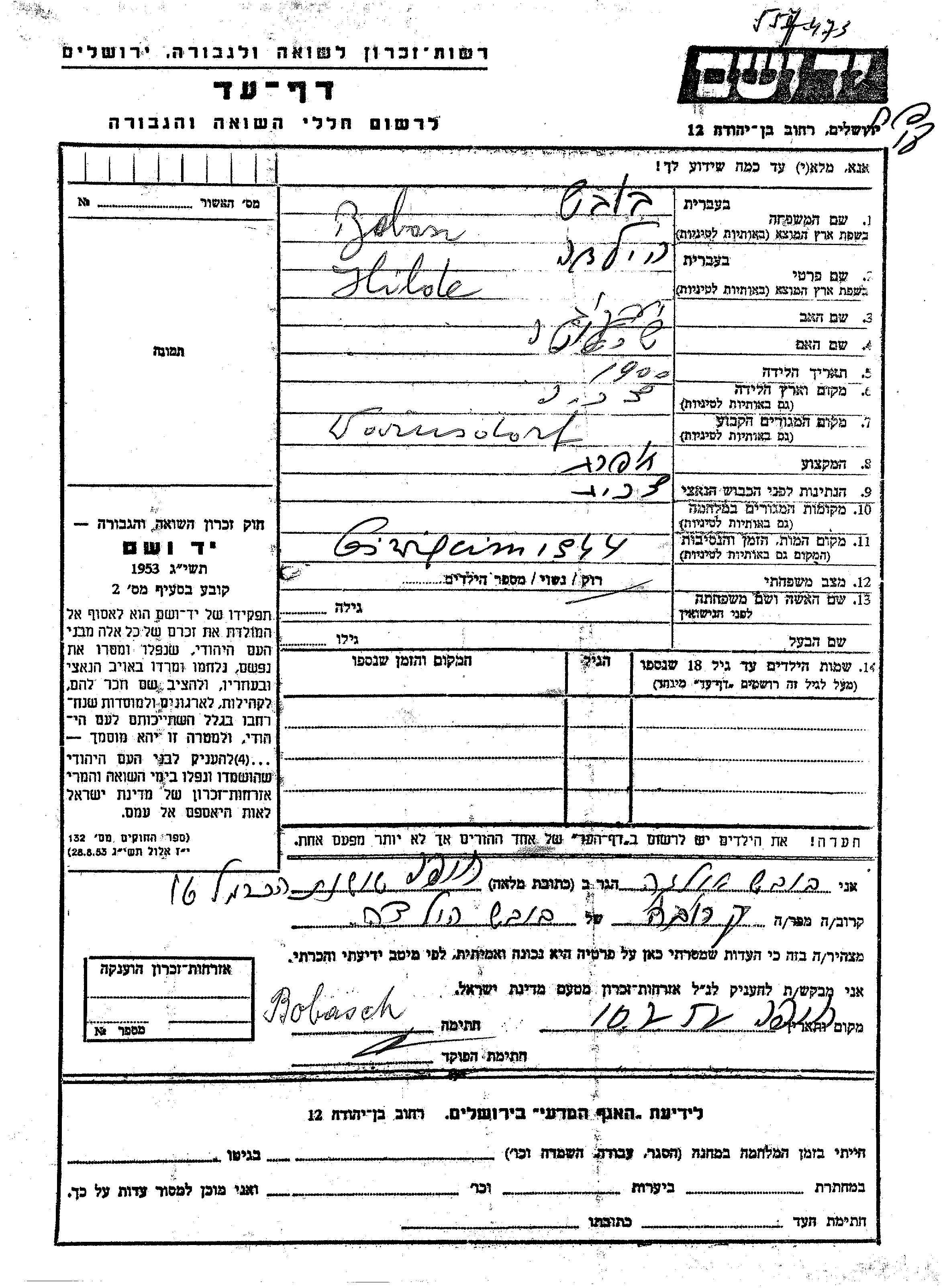 Hilde Bobasz wurde im Jahr 1900 in Tschechoslowakei geboren. Sie war die Tochter von Yaakov und Sharlota. Sie war Schneiderin und Ledig. Vor dem Zweiten Weltkrieg lebte sie in Varnsdorf, Tschechoslowakei.