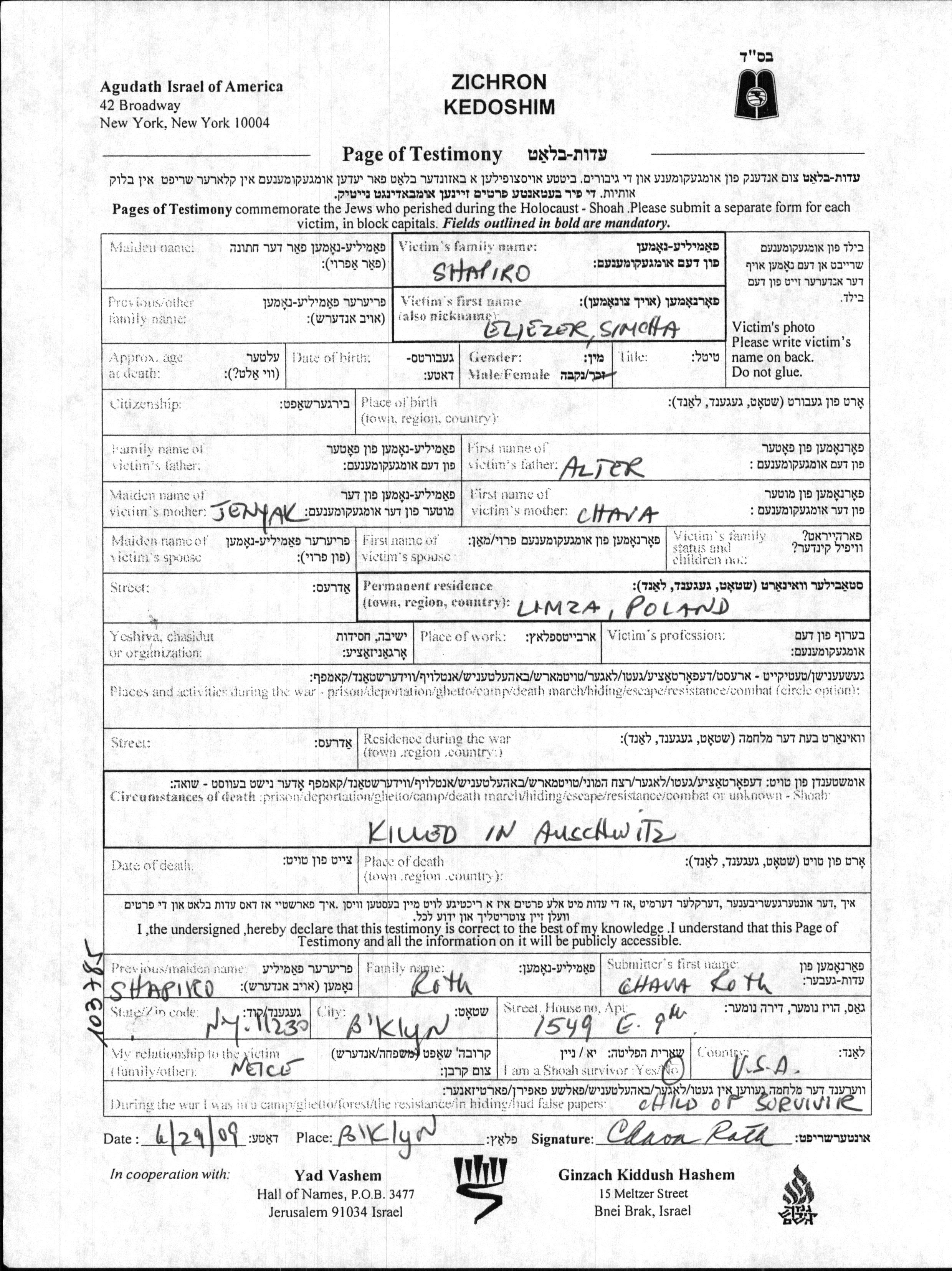 Eliezer Simcha Shapiro wurde Er war der Sohn von Alter und Chava, geb. Jenyak. Vor dem Zweiten Weltkrieg lebte er in Łomża, Polen.