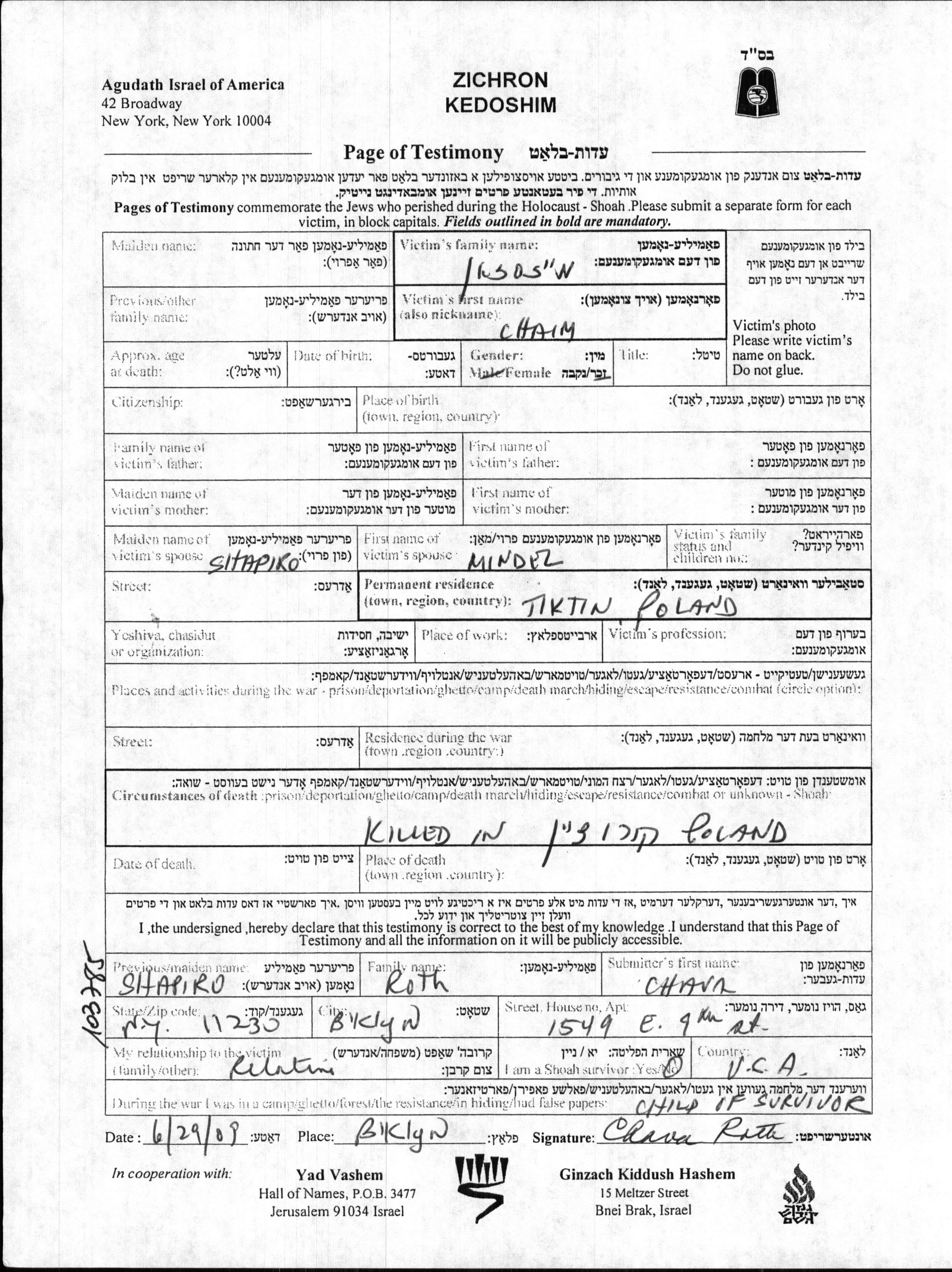 Chaim wurde in der Schoah ermordet. Todesort: Koroczyn, Polen.