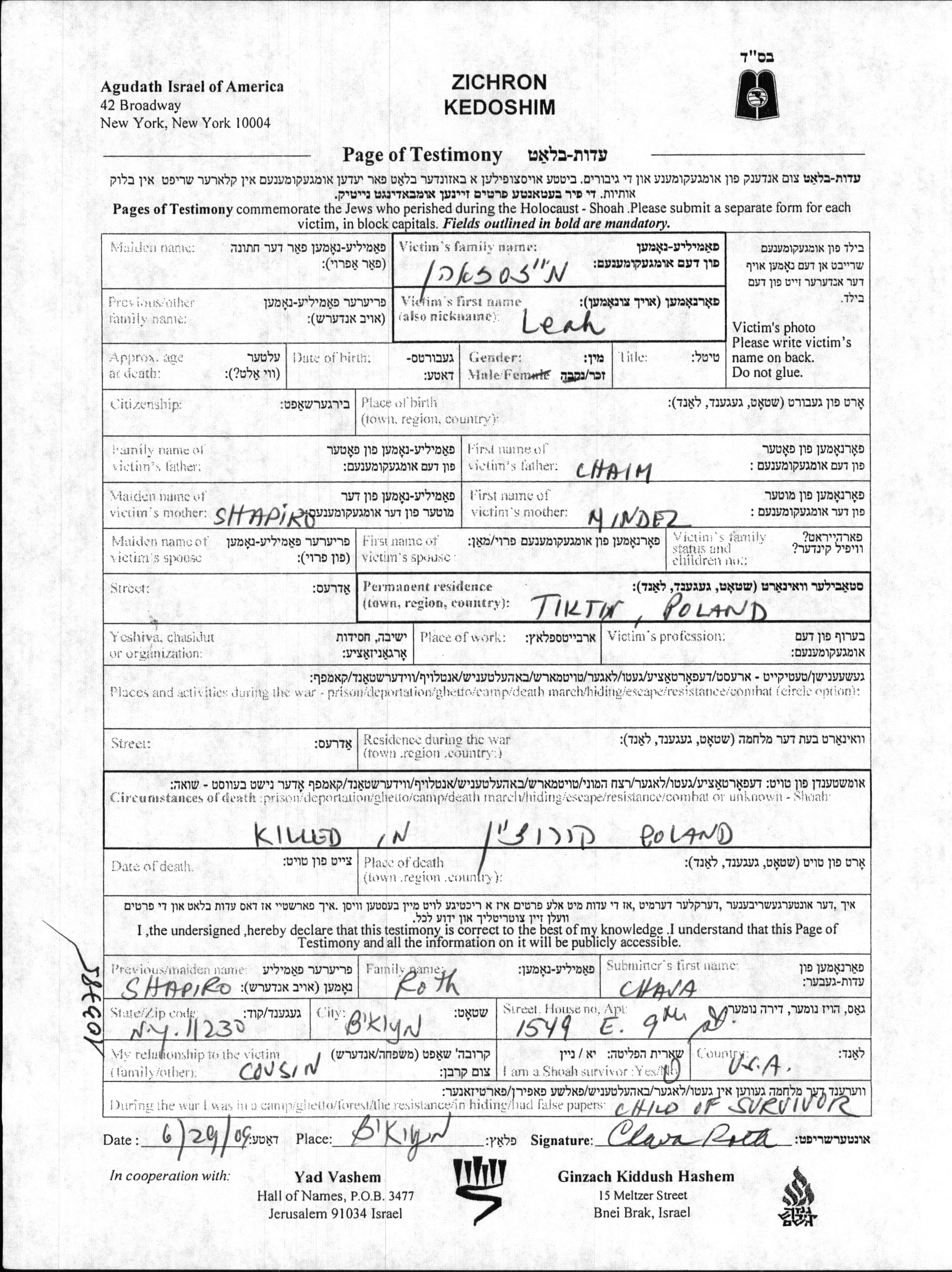 Leah Maizessohn wurde Sie war die Tochter von Chaim und Mindel, geb. Shapiro. Vor dem Zweiten Weltkrieg lebte sie in Tiktin, Polen. Während des Krieges war sie in Polen.