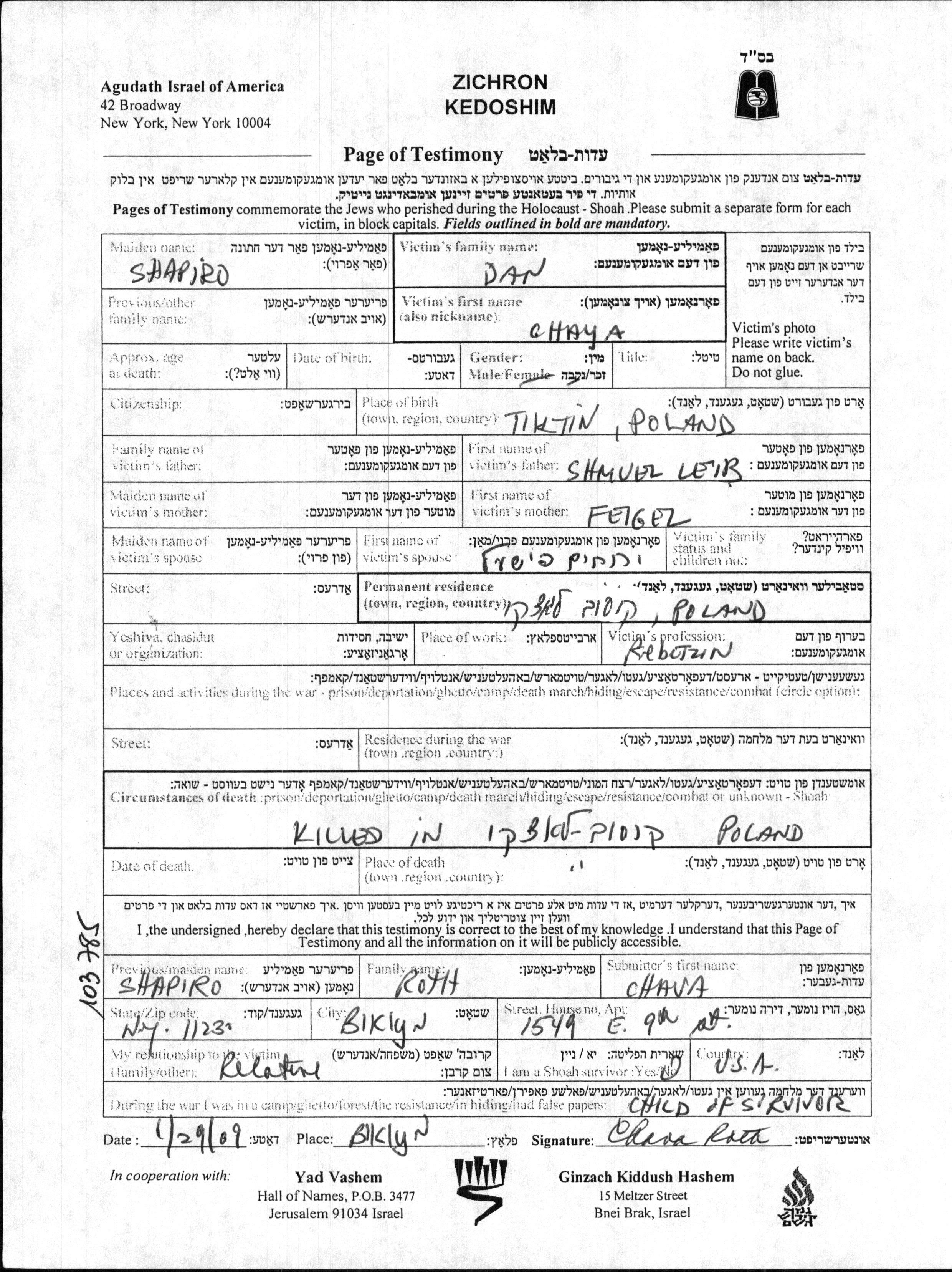 Chaya Dan, geb. Shapiro wurde in Tiktin, Polen geboren. Sie war die Tochter von Shmuel Leib und Feigel. Sie war Frau eines rabbiners und mit Yerukham Fishel Verheiratet. Vor dem Zweiten Weltkrieg lebte sie in Kosow Lacki, Polen. Während des Krieges war sie in Kosow Lacki, Polen.