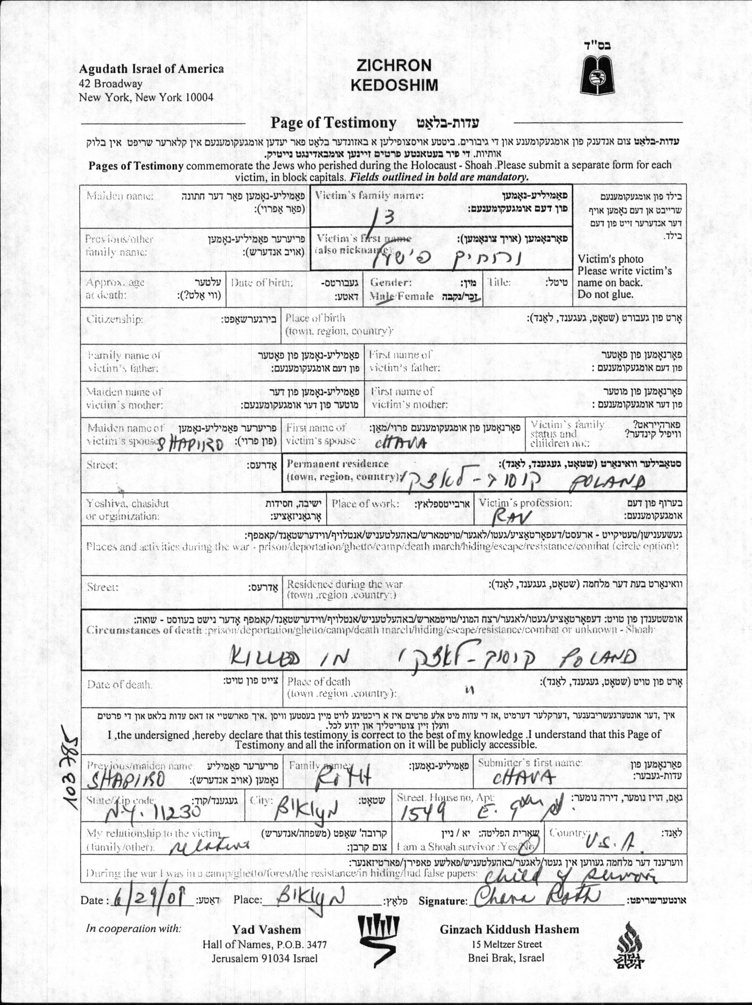 Fishel Yerukham Den. Er war Rabbiner und mit Chava, geb. Shapiro Verheiratet. Vor dem Zweiten Weltkrieg lebte er in Kosow Lacki, Polen. Während des Krieges war er in Kosow Lacki, Polen.