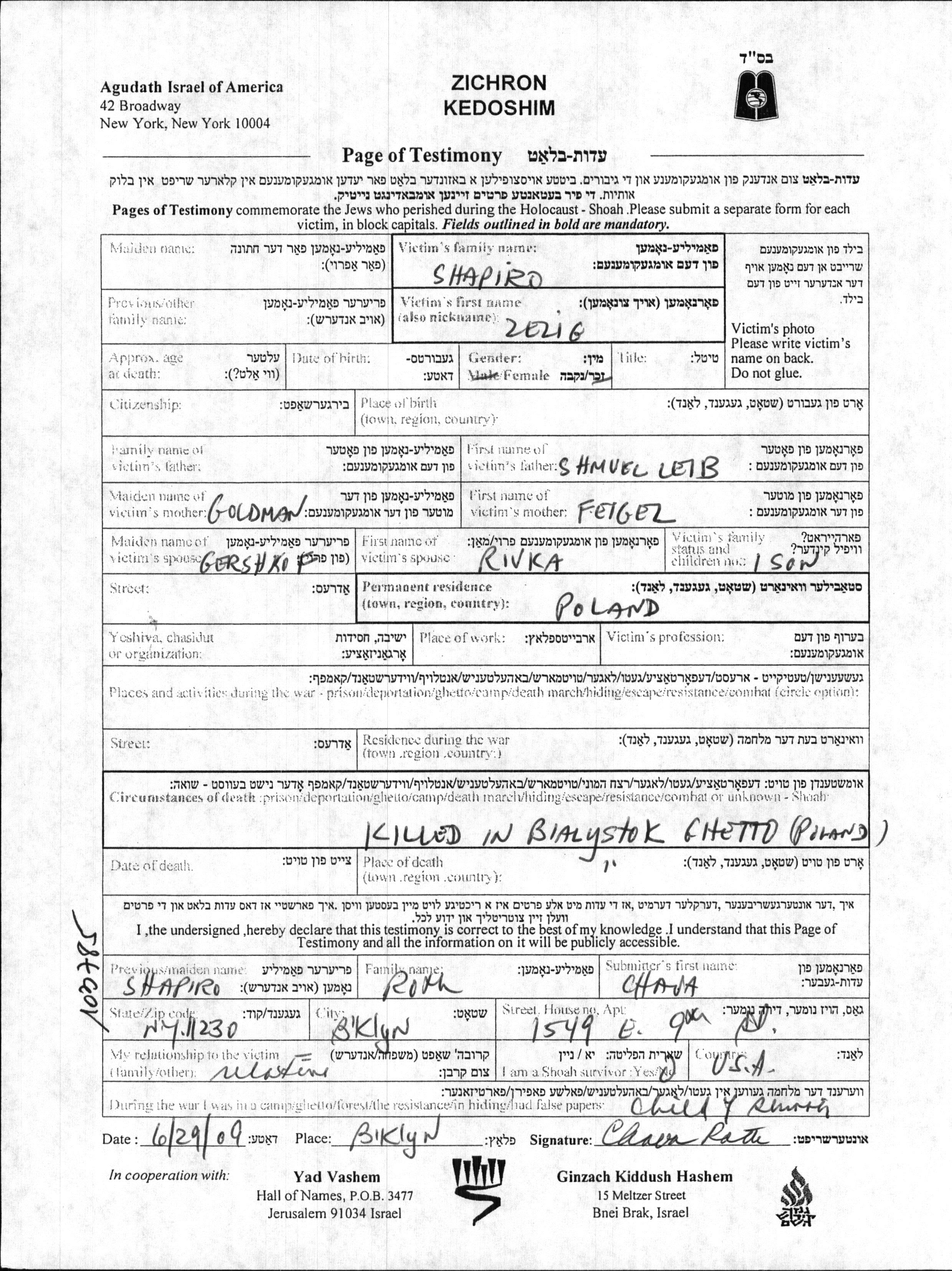 Zelig Shapiro wurde Er war der Sohn von Shmuel Leib und Feigel, geb. Goldman. Er war mit Rivka, geb. Gershkof Verheiratet. Vor dem Zweiten Weltkrieg lebte er in Polen. Während des Krieges war er in Bialystok, Polen.
