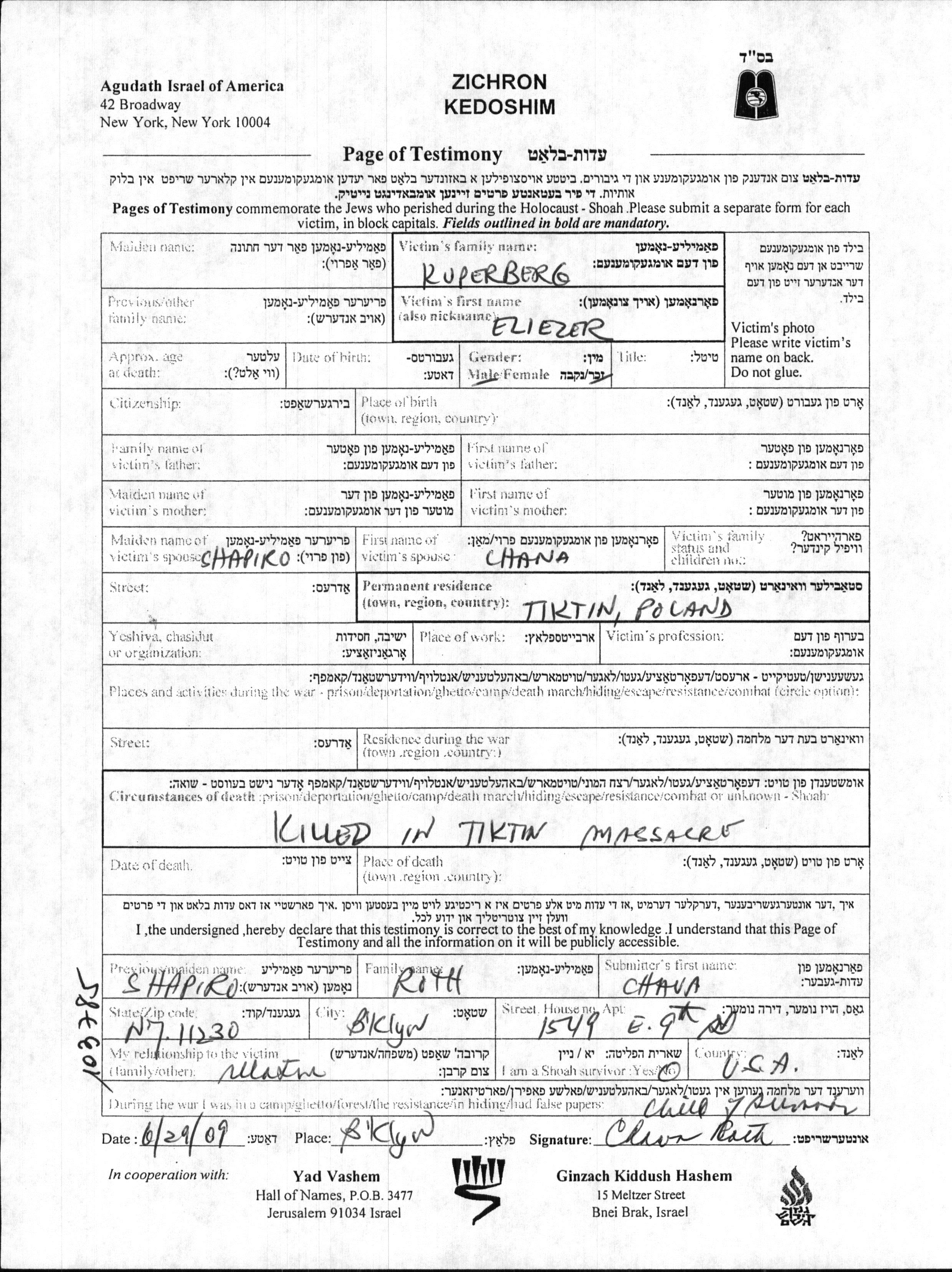 Eliezer wurde in der Schoah ermordet. Todesort: Tiktin, Polen.
