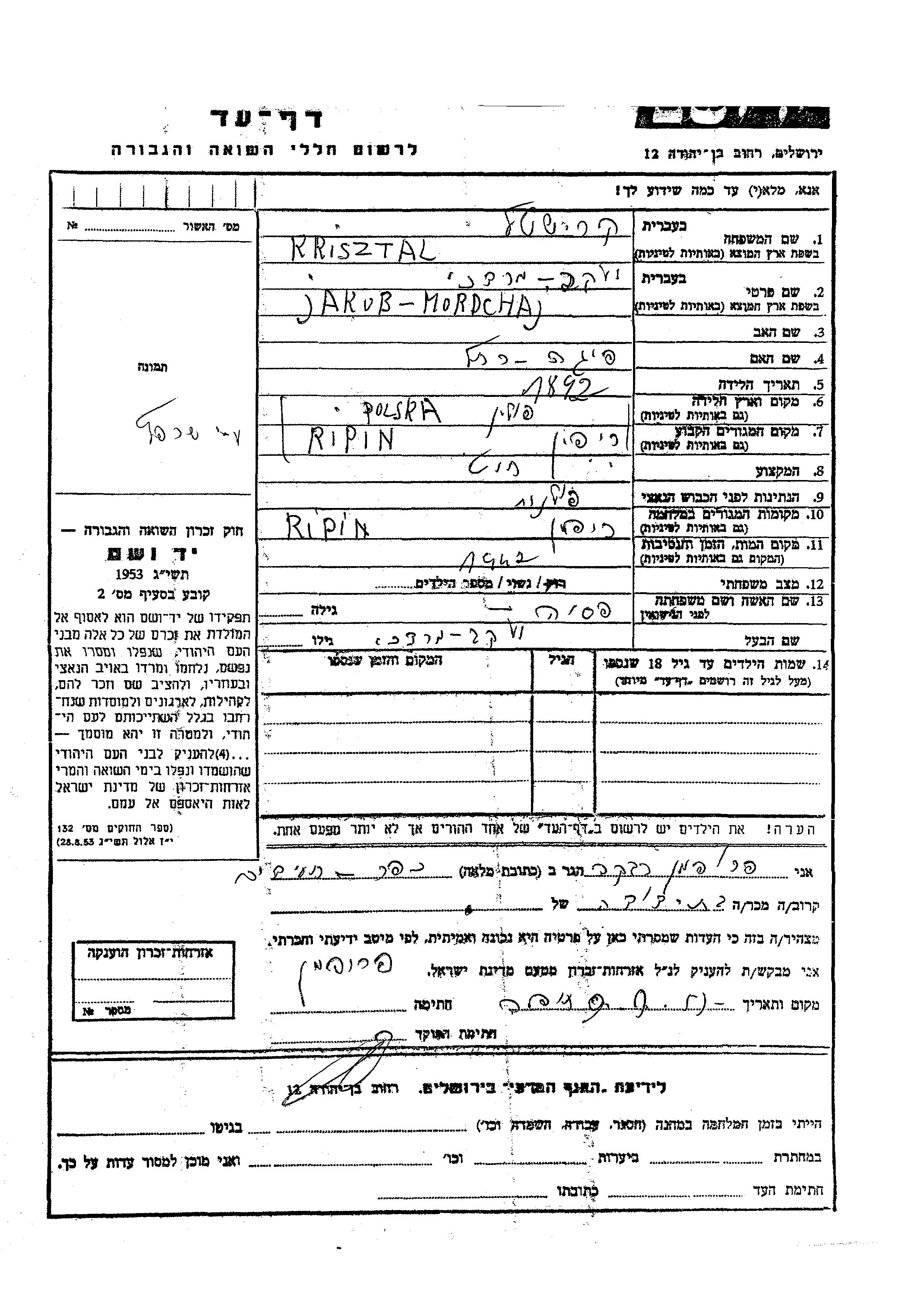 Jakob Mordchaj Krisztal wurde im Jahr 1892 in Ripin, Polen geboren. Er war der Sohn von Feiga Rakhel. Er war Schneider und mit Pesia Verheiratet. Vor dem Zweiten Weltkrieg lebte er in Ripin, Polen. Während des Krieges war er in Ripin, Polen.