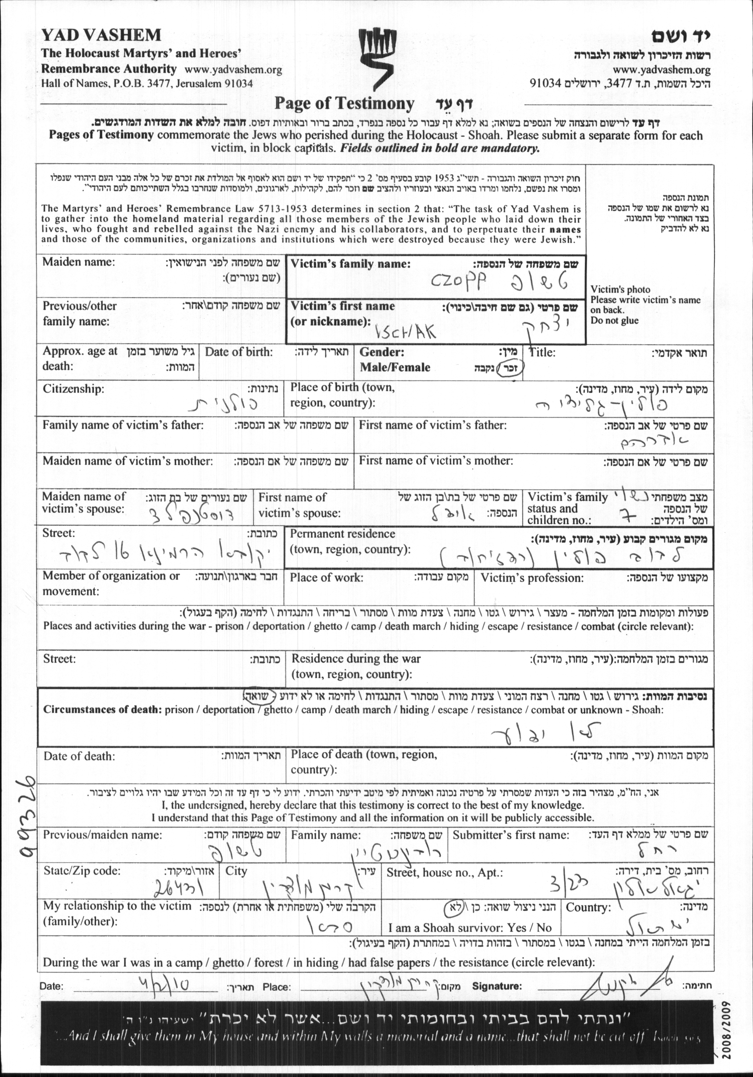 Ischak Czopp wurde in Galizien Region, Polen geboren. Er war der Sohn von Avraham. Er war mit Idel, geb. Distenfeld Verheiratet. Vor dem Zweiten Weltkrieg lebte er in Lwow, Polen.