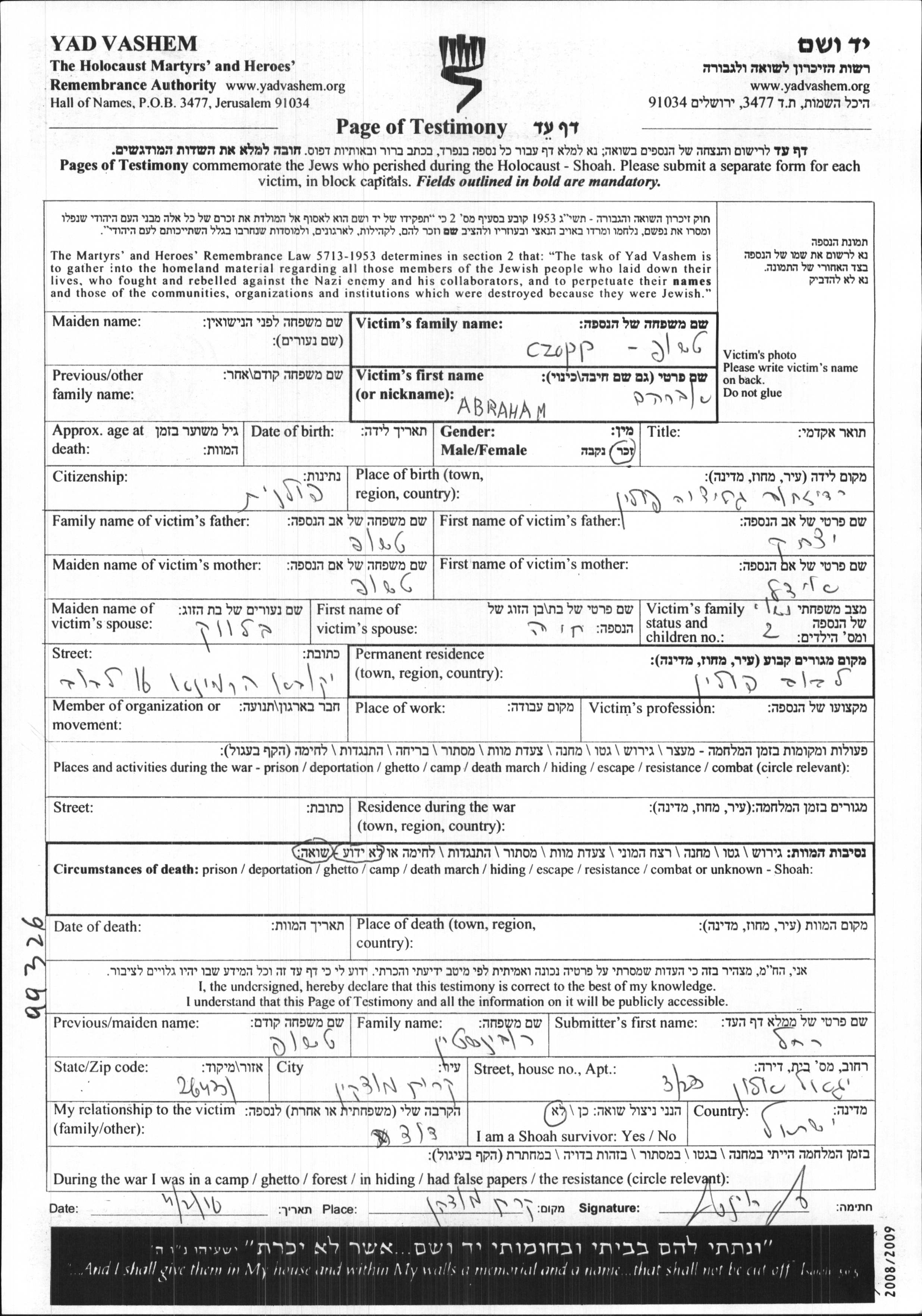 Abraham Czopp wurde in Radziechow, Polen geboren. Er war der Sohn von Yitzkhak und Idel. Er war mit Chaia, geb. Bleikh Verheiratet. Vor dem Zweiten Weltkrieg lebte er in Lwow, Polen.