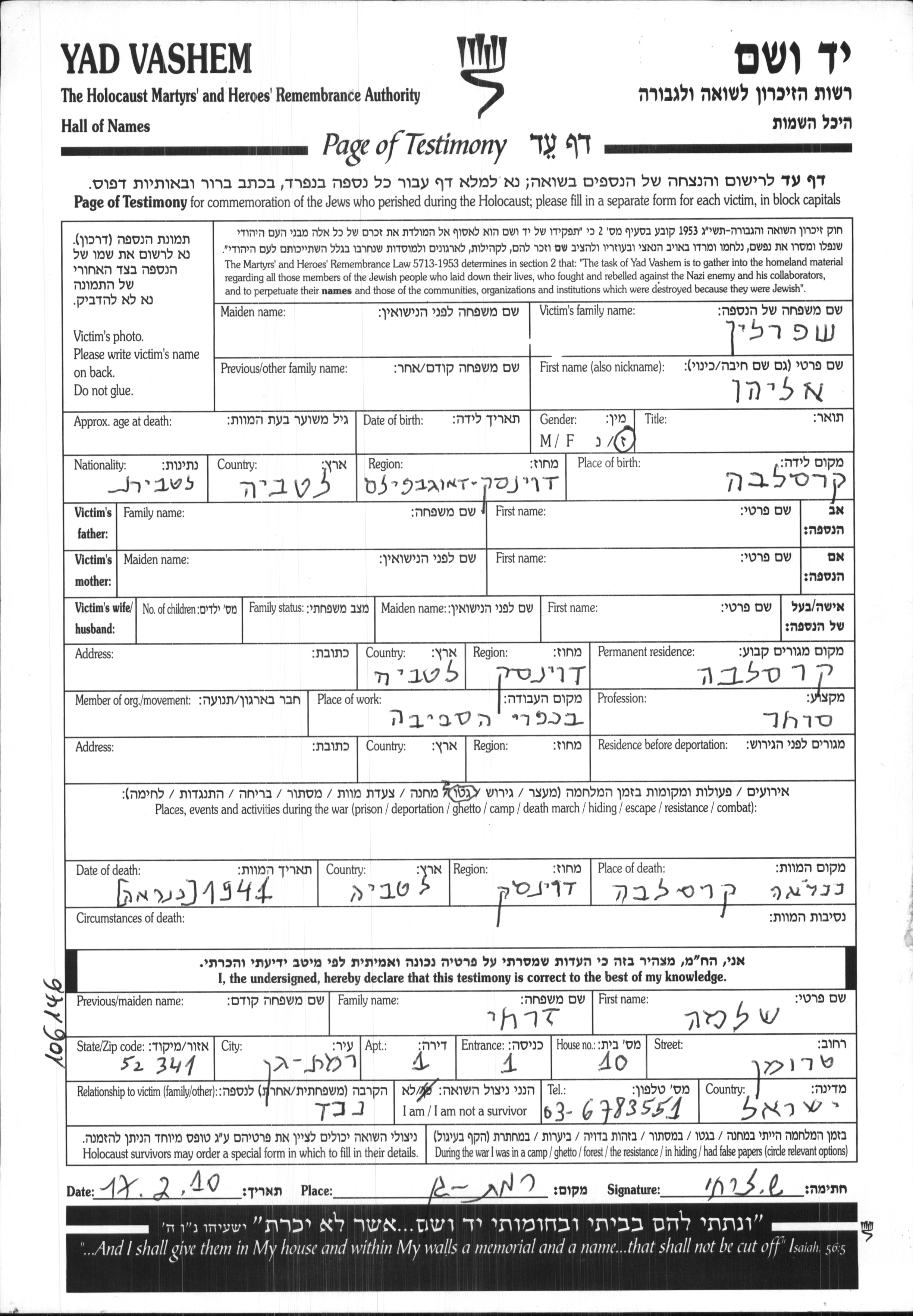 Eliahu wurde in der Schoah ermordet. Todesort: Kraslava, Lettland im Jahr 1941.