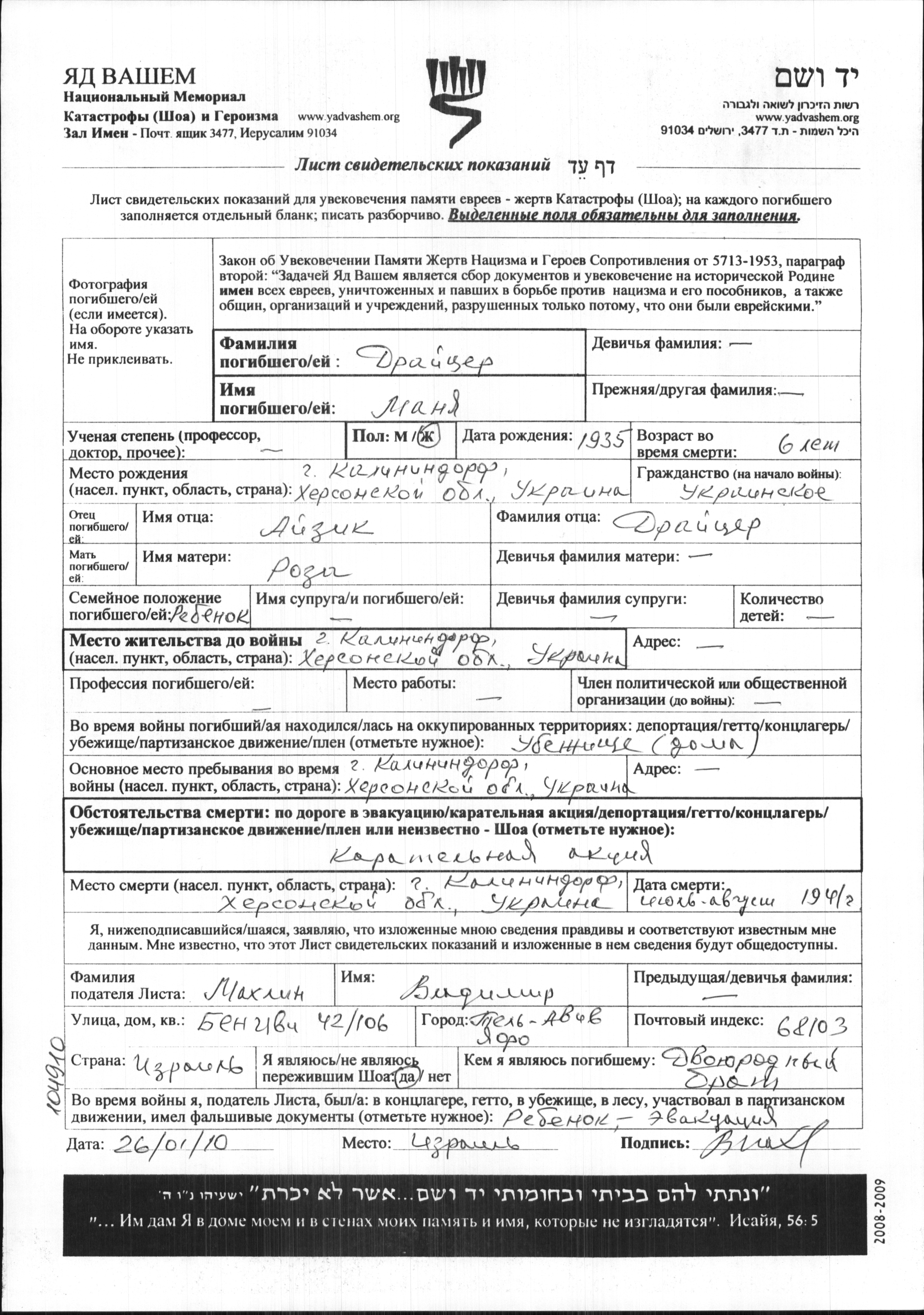 Manya Draytzer wurde im Jahr 1935 in Kalinindorf, Ukraine (UdSSR) geboren. Sie war die Tochter von Ayzik und Roza. Sie war Kind. Vor dem Zweiten Weltkrieg lebte sie in Kalinindorf, Ukraine (UdSSR). Während des Krieges war sie in Kalinindorf, Ukraine (UdSSR).