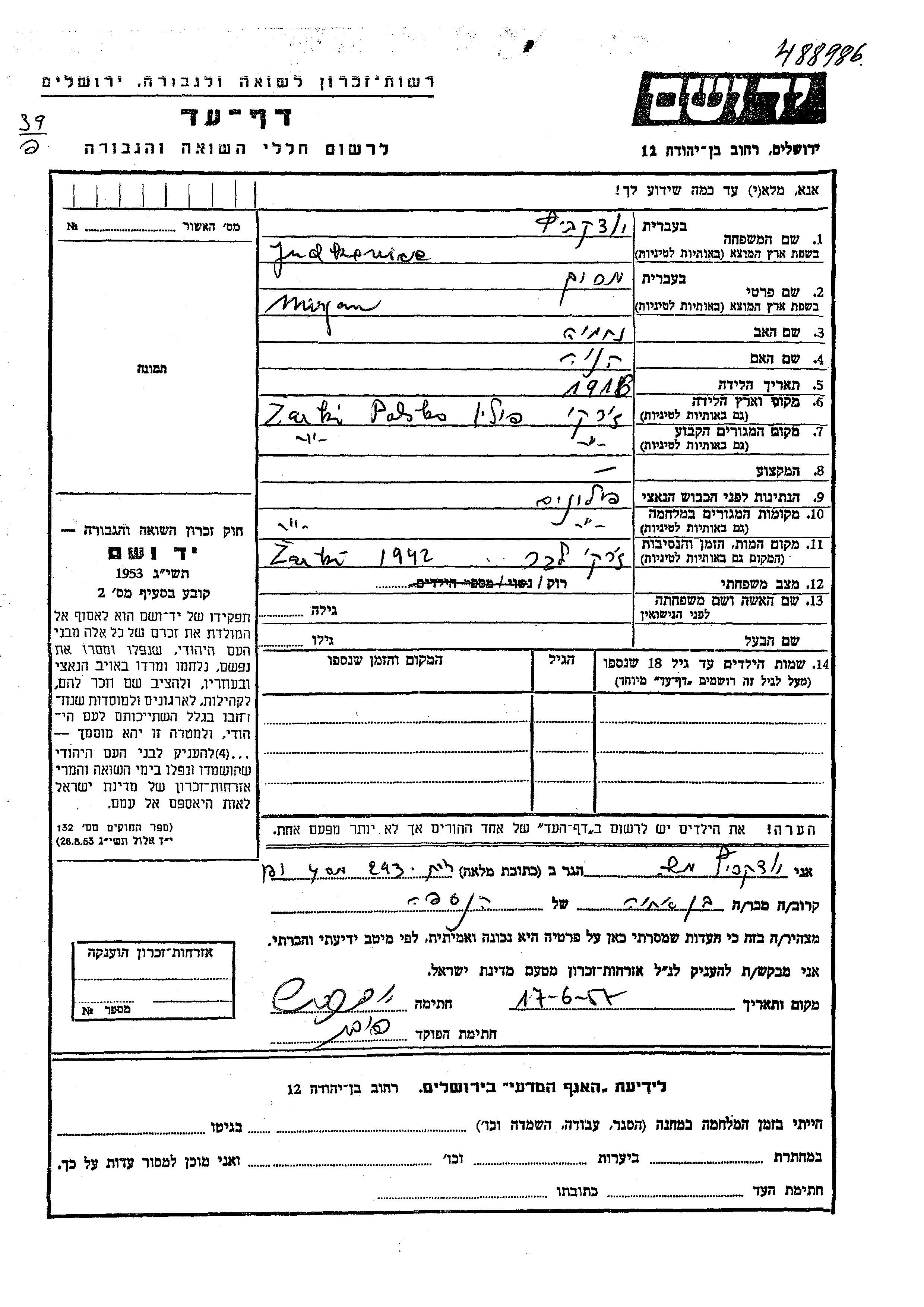 Miryam Judkewicz wurde im Jahr 1918 in Zarki, Polen geboren. Sie war die Tochter von Nekhemia und Henia. Sie war Ledig. Vor dem Zweiten Weltkrieg lebte sie in Zarki, Polen. Während des Krieges war sie in Zarki, Polen.