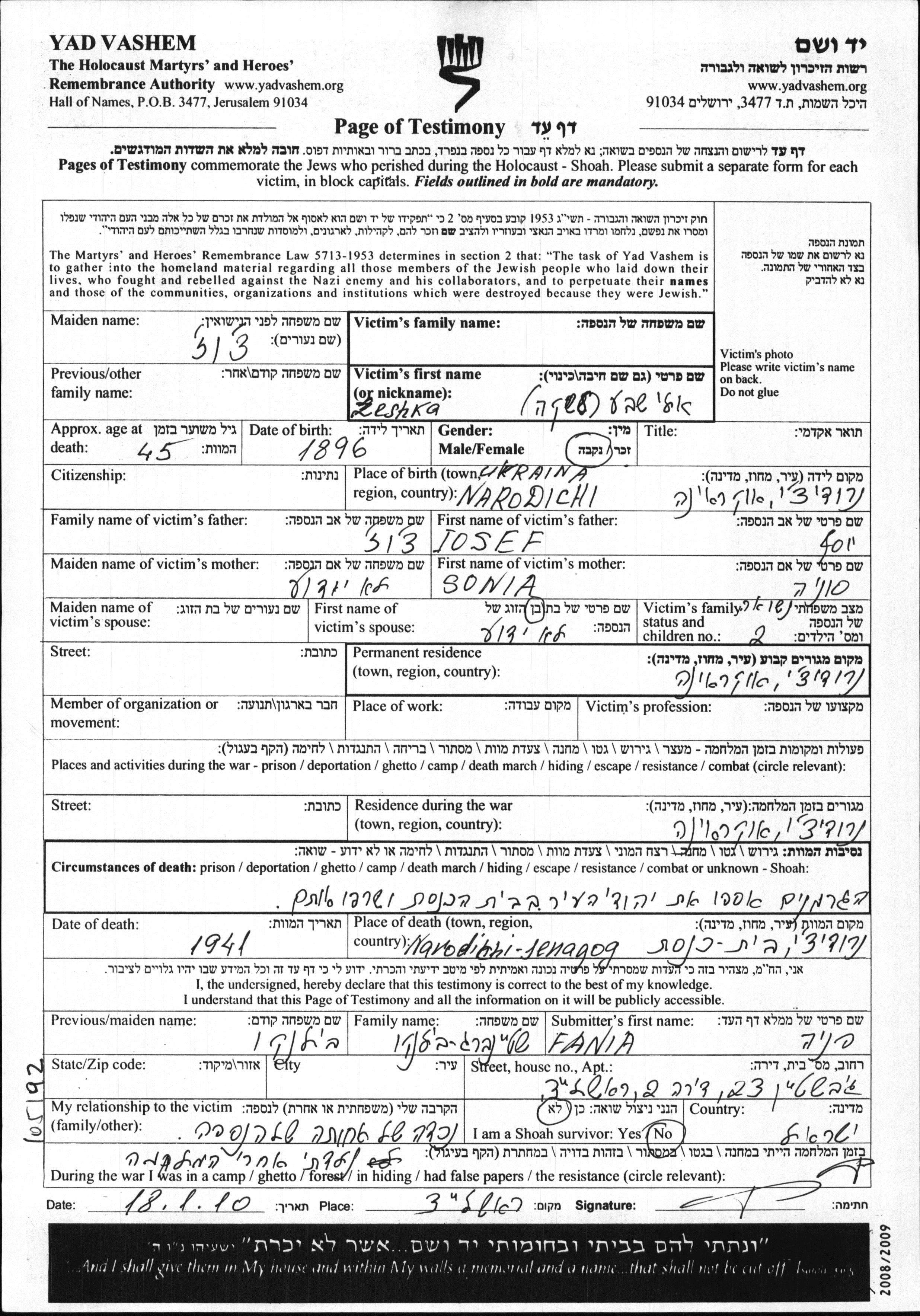 Name unbekannt Elisheva Leshka 1896 Narodichi, Ukraine (UdSSR) Gedenkblatt