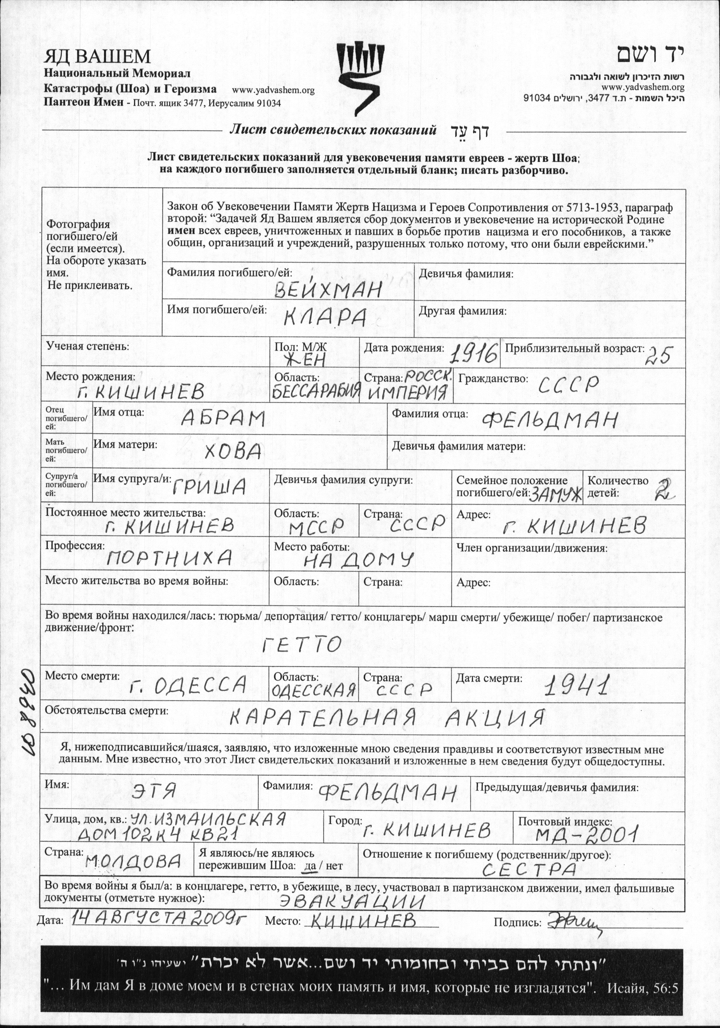 Klara Veikhman, geb. Feldman wurde im Jahr 1916 in Kisinev, Rumänien geboren. Sie war die Tochter von Abram und Khova. Sie war Schneider und mit Grisha Verheiratet. Vor dem Zweiten Weltkrieg lebte sie in Kisinev, Rumänien. Während des Krieges war sie in Odessa, Ukraine (UdSSR).