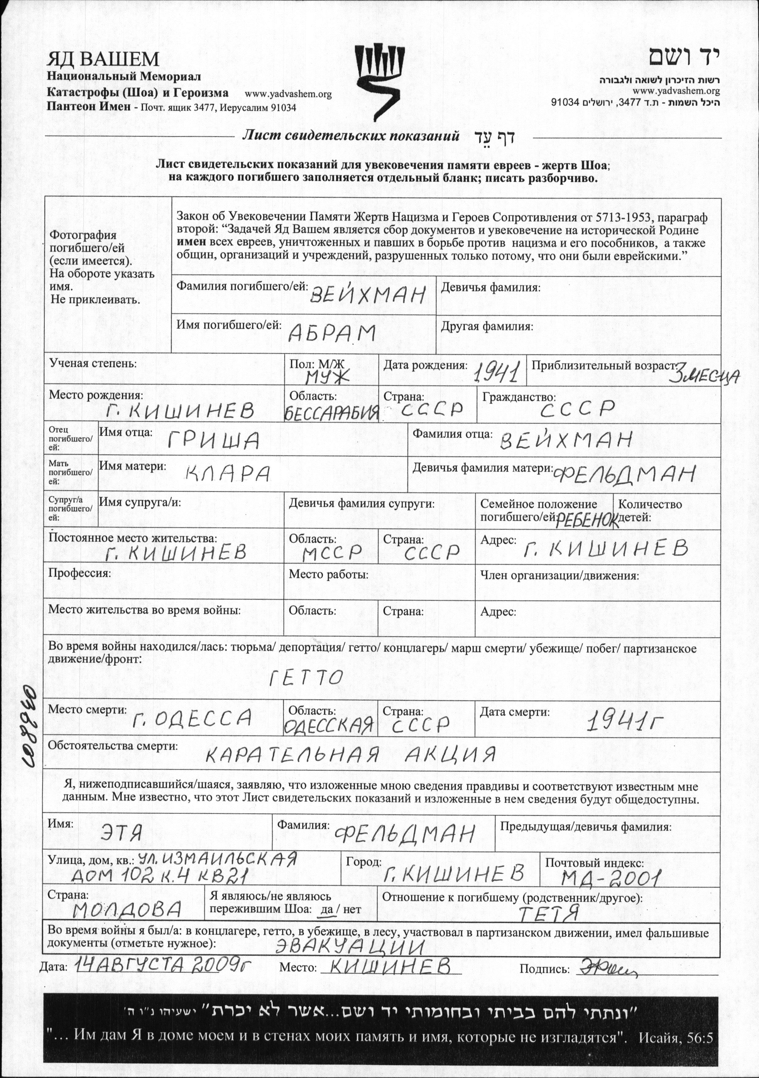 Veikhman Abram 1941 Kisinev, Rumänien Gedenkblatt