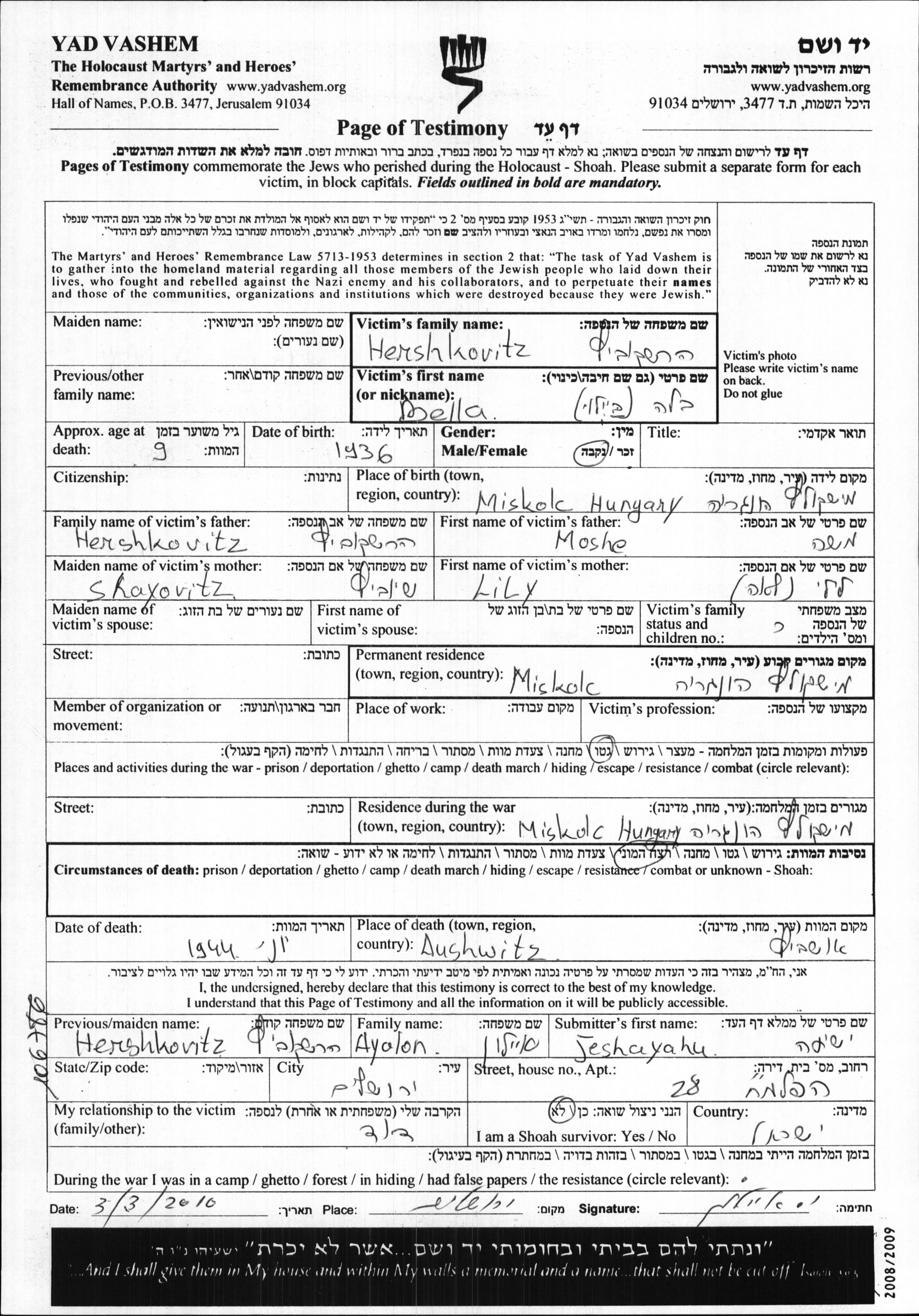 Hershkovitz Bella 1936 Miskolc, Ungarn Gedenkblatt