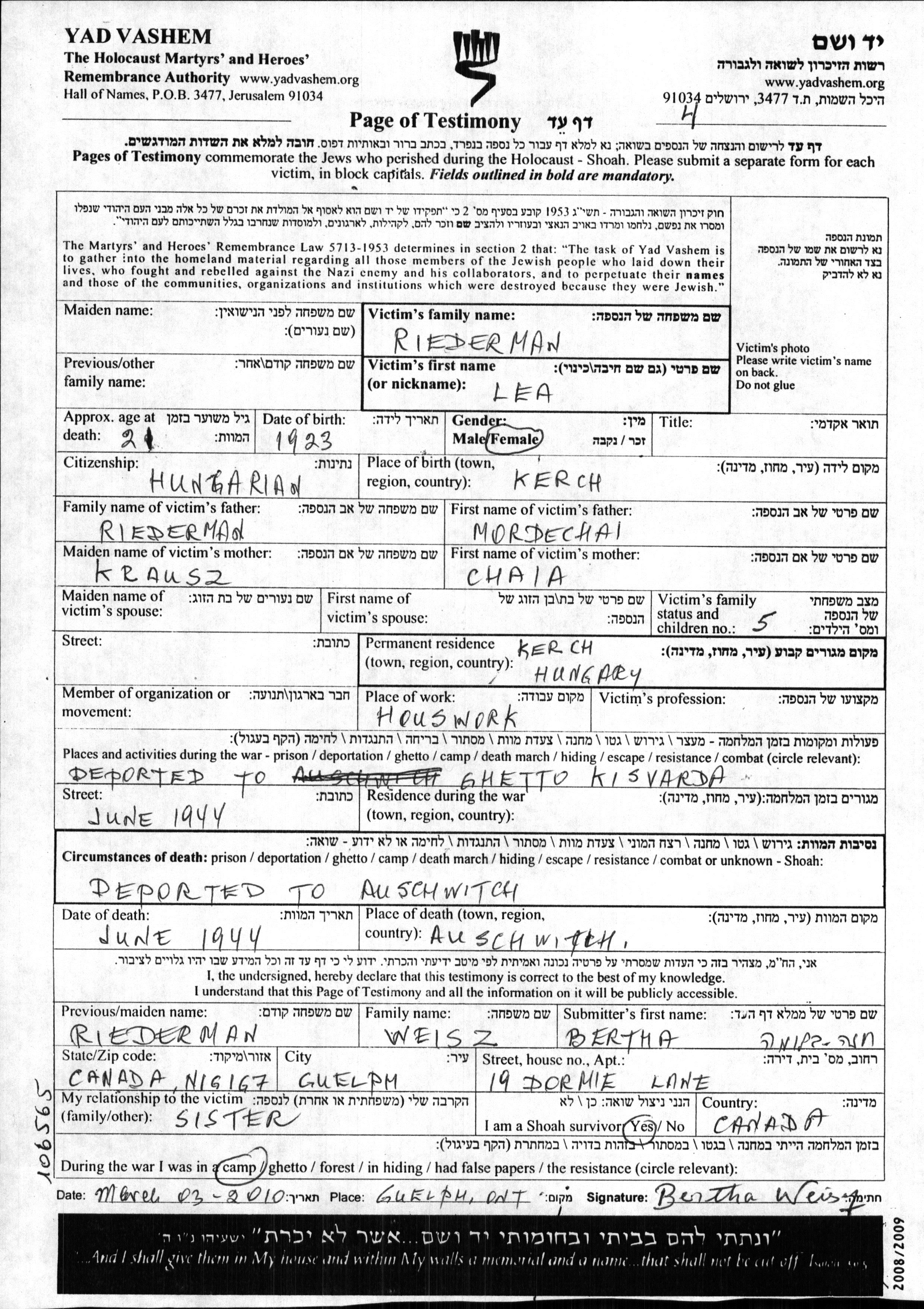 Lea Riederman wurde im Jahr 1923 in Kercs, Ungarn geboren. Sie war die Tochter von Mordechai und Chaia, geb. Krausz. Sie war Housework und Verheiratet. Vor dem Zweiten Weltkrieg lebte sie in Kercs, Ungarn. Während des Krieges war sie in Kisvarda, Ungarn.
