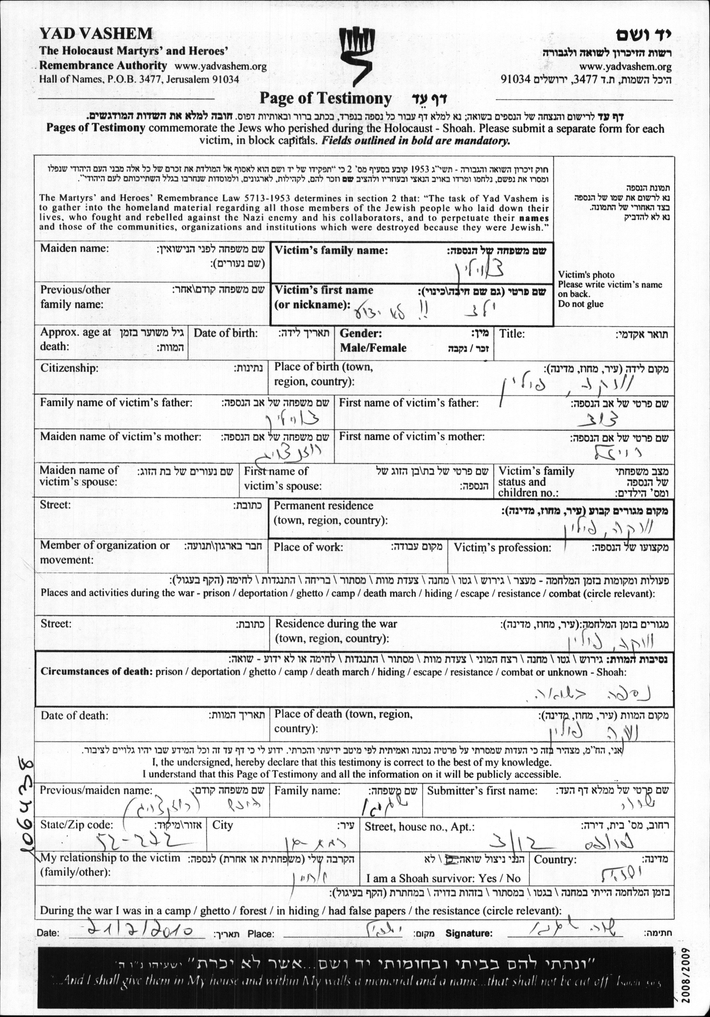 Tzvilikh Tzvilik Vorname unbekannt Warka, Polen Gedenkblatt