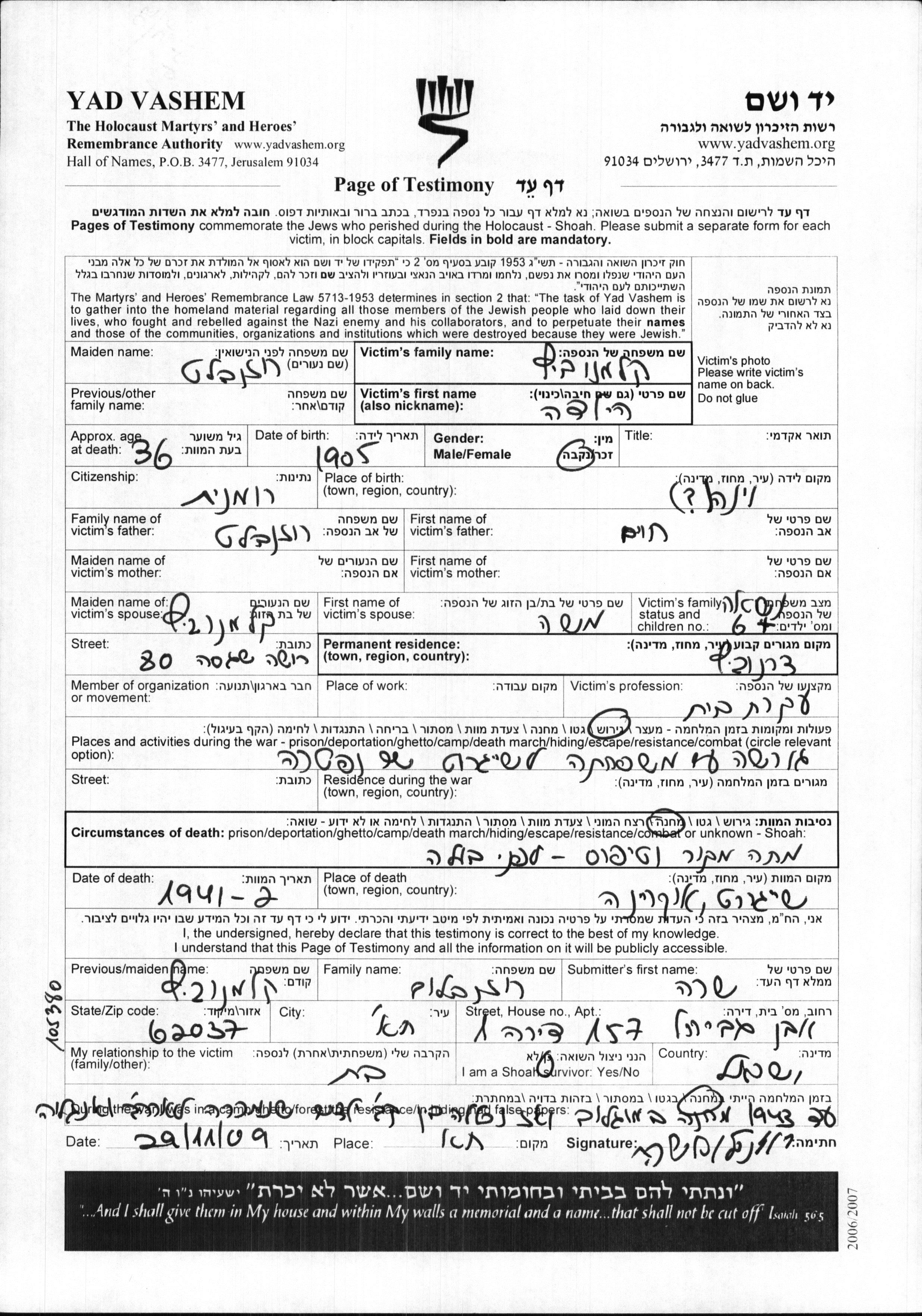 Hilda Kalmanovitz, geb. Rozenblat wurde im Jahr 1905 in Wien, Österreich geboren. Sie war die Tochter von Chaim. Sie war Hausfrau und mit Moshe Verheiratet. Vor dem Zweiten Weltkrieg lebte sie in Chernovitz, Rumänien. Während des Krieges war sie in Chernovitz, Rumänien.