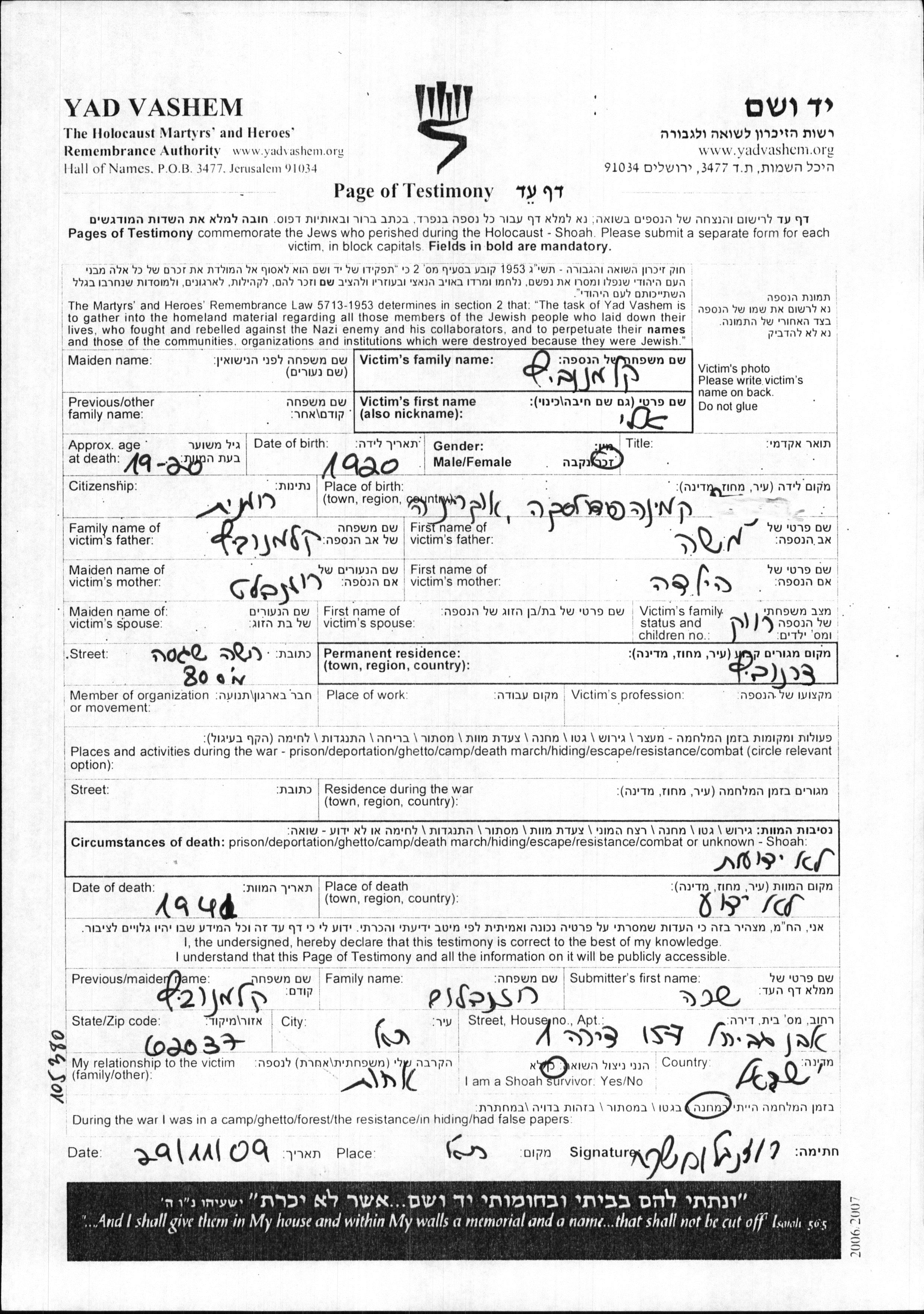 Kalmanovitz Eli 1920 Chernovitz, Rumänien Gedenkblatt