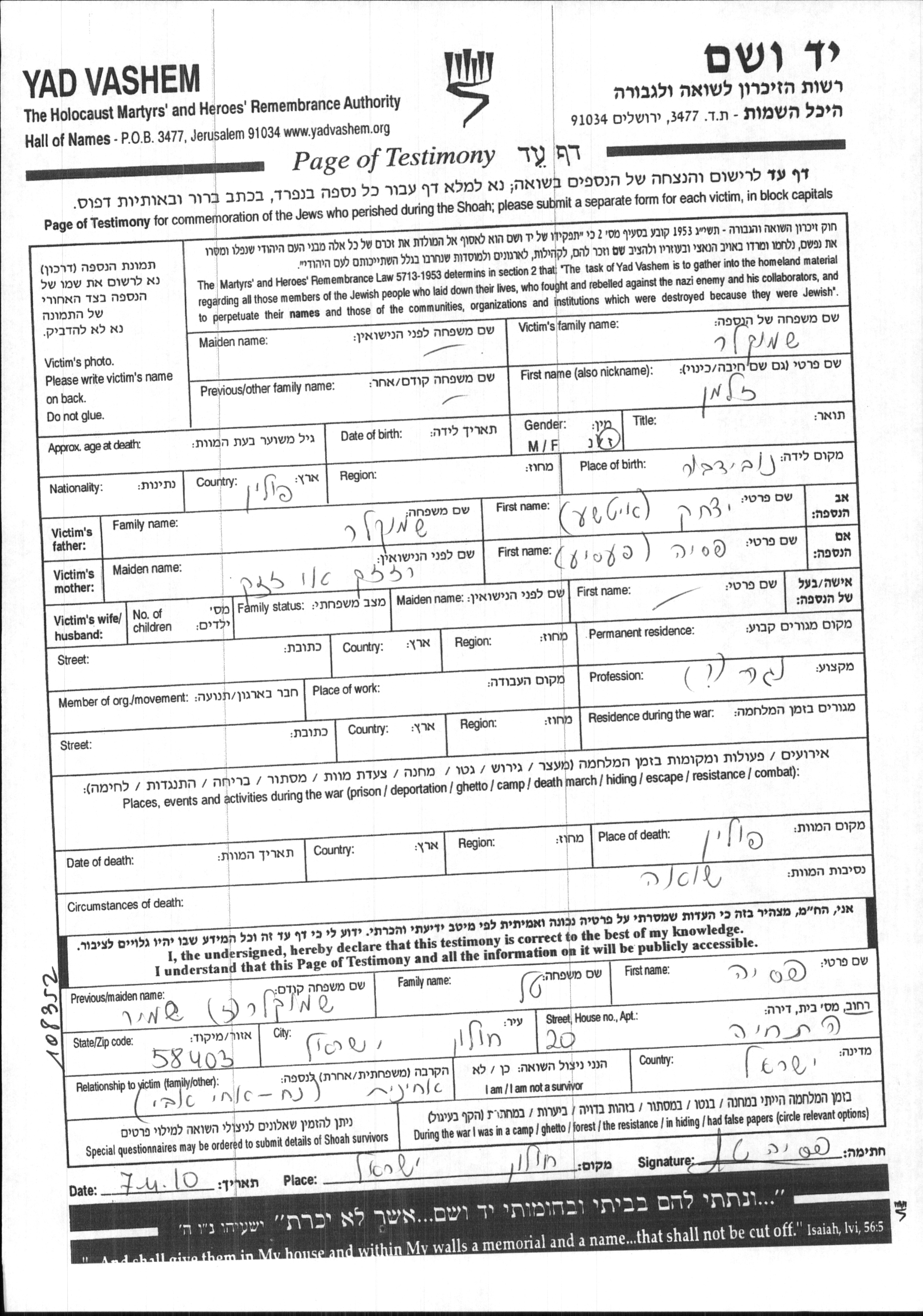 Shmukler Zelman unbekannter Ort, Gedenkblatt