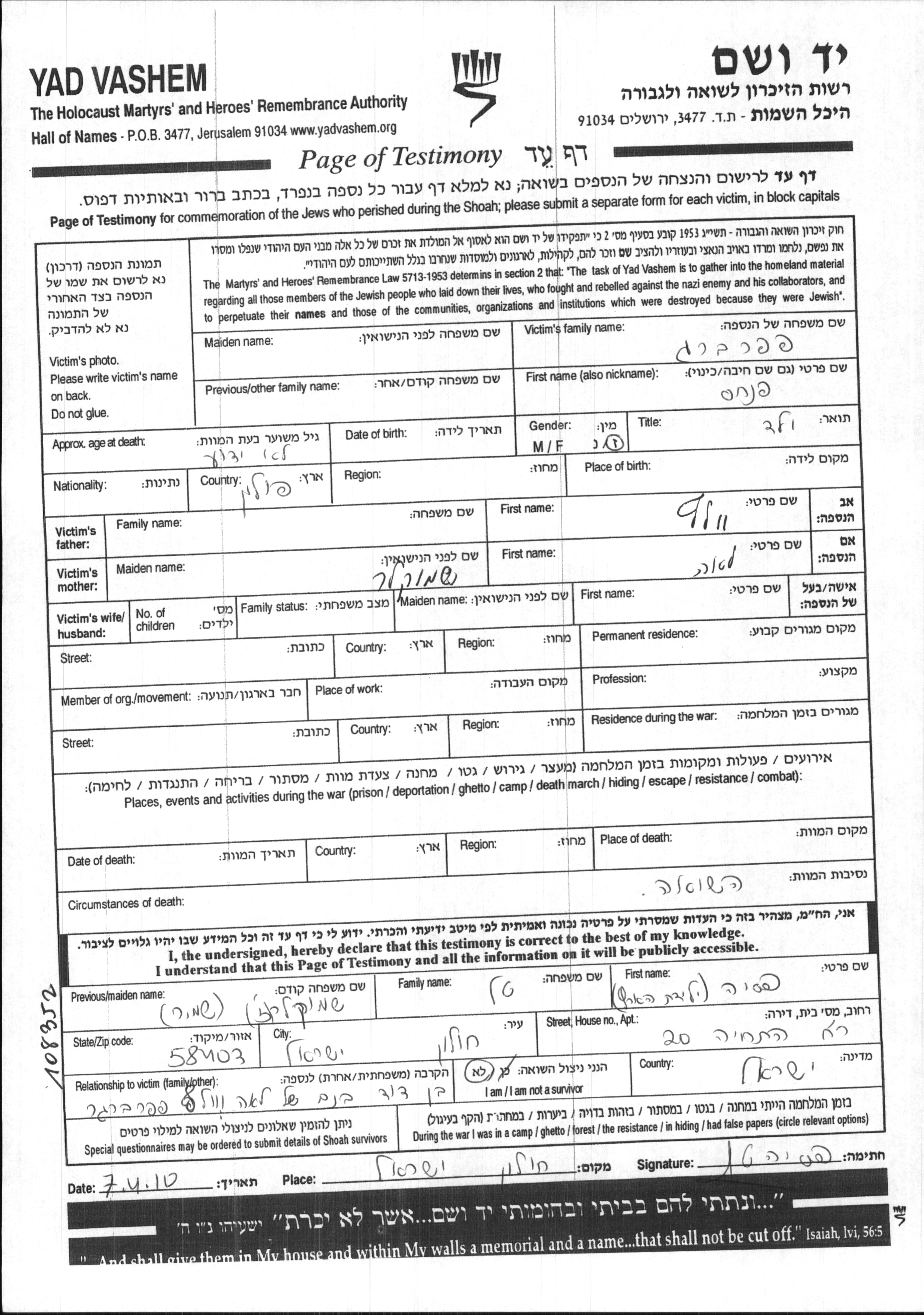 Pinkhas wurde in der Schoah ermordet.