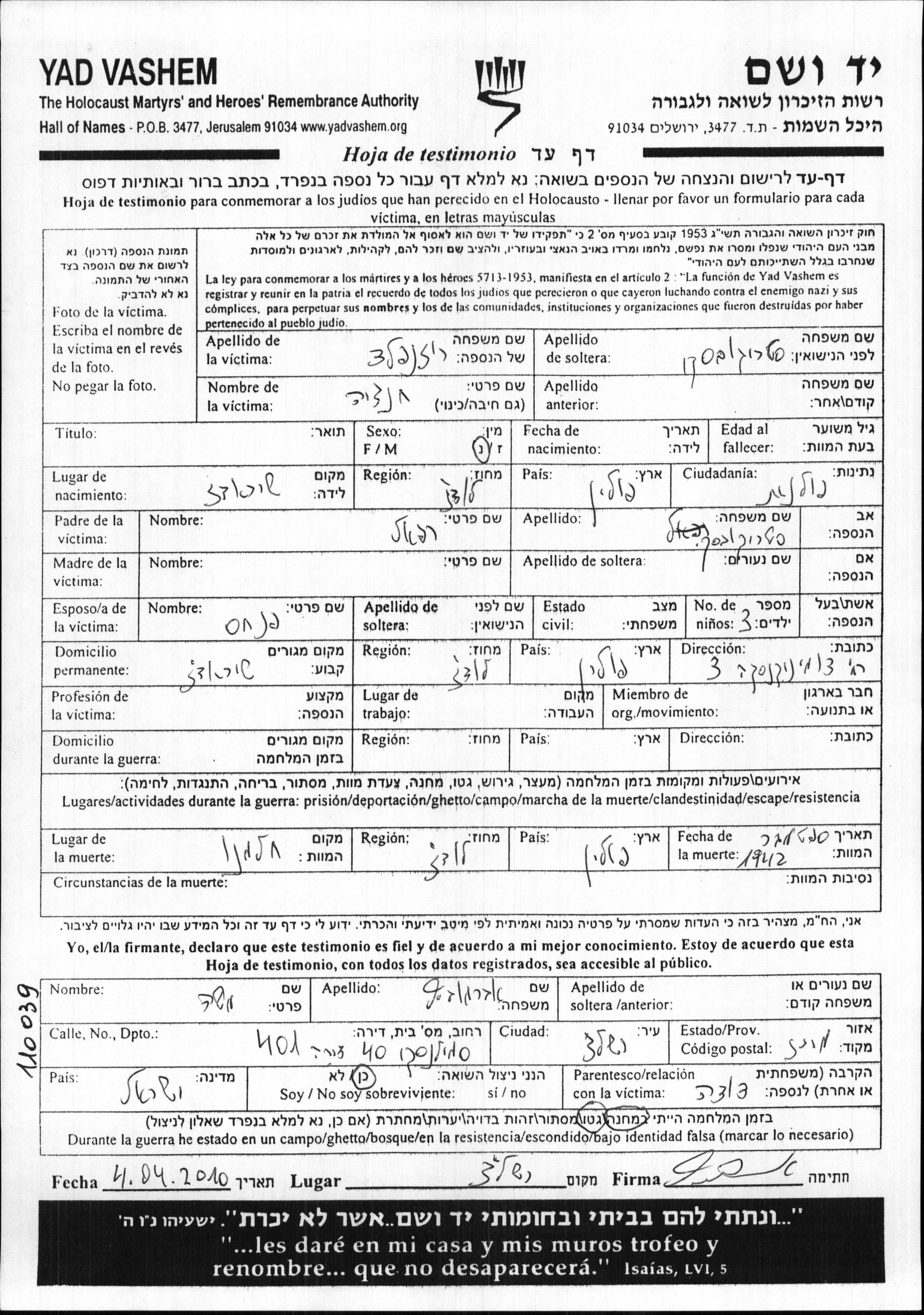 Khana Rozenfeld, geb. Strokovski wurde in Sieradz, Polen geboren. Sie war die Tochter von Rafael. Sie war mit Pinkhas Verheiratet. Vor dem Zweiten Weltkrieg lebte sie in Sieradz, Polen. Während des Krieges war sie in Sieradz, Polen.