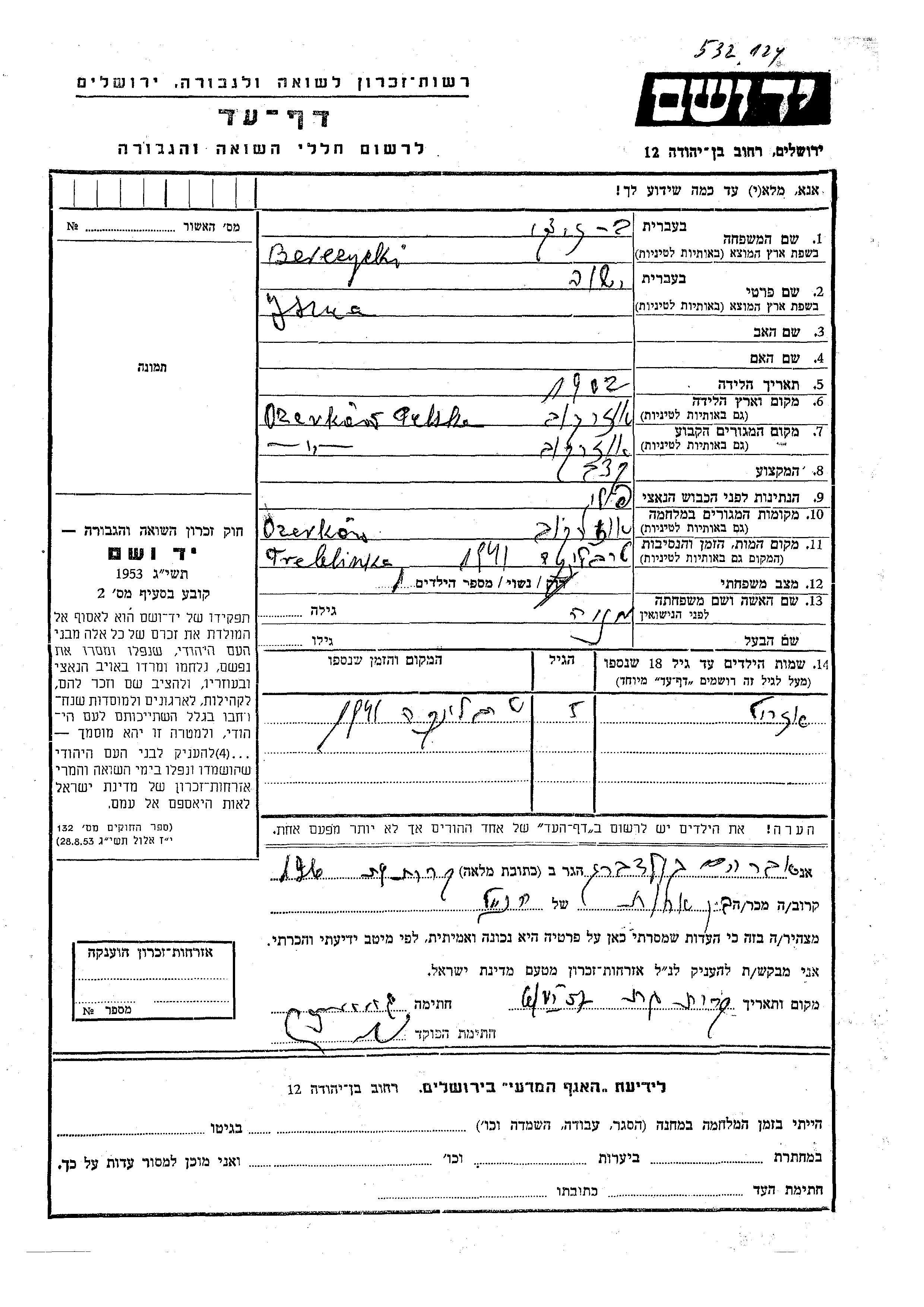 Jszua Berezycki wurde im Jahr 1902 in Ozerkov, Polen geboren. Er war Metzger/-in und mit Mania Verheiratet. Vor dem Zweiten Weltkrieg lebte er in Ozerkov, Polen. Während des Krieges war er in Ozerkov, Polen.