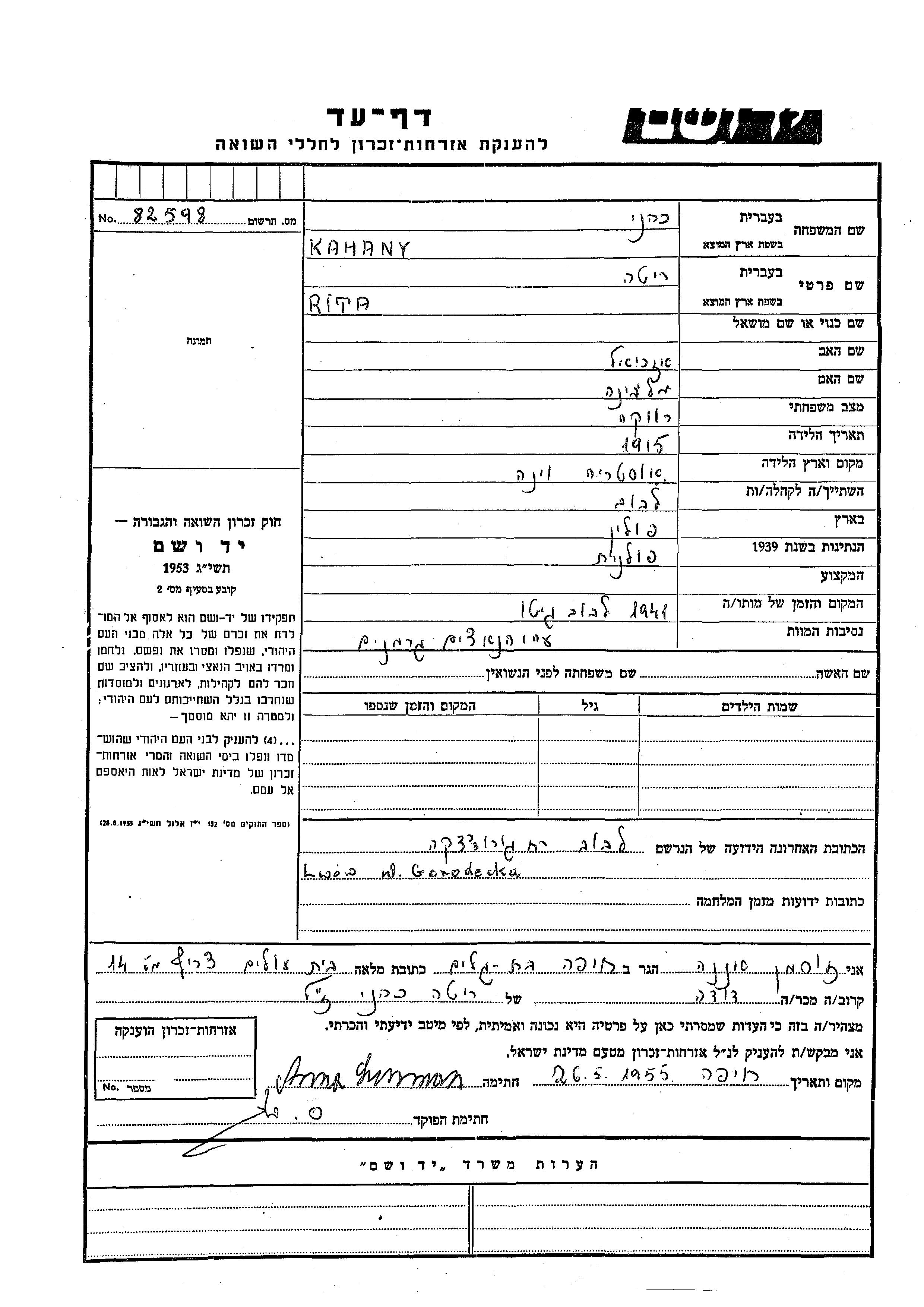 Rita Kahany wurde im Jahr 1915 in Wien, Österreich geboren. Sie war die Tochter von Azriel und Malvina. Sie war Ledig. Vor dem Zweiten Weltkrieg lebte sie in Lwow, Polen. Während des Krieges war sie in Lwow, Polen.