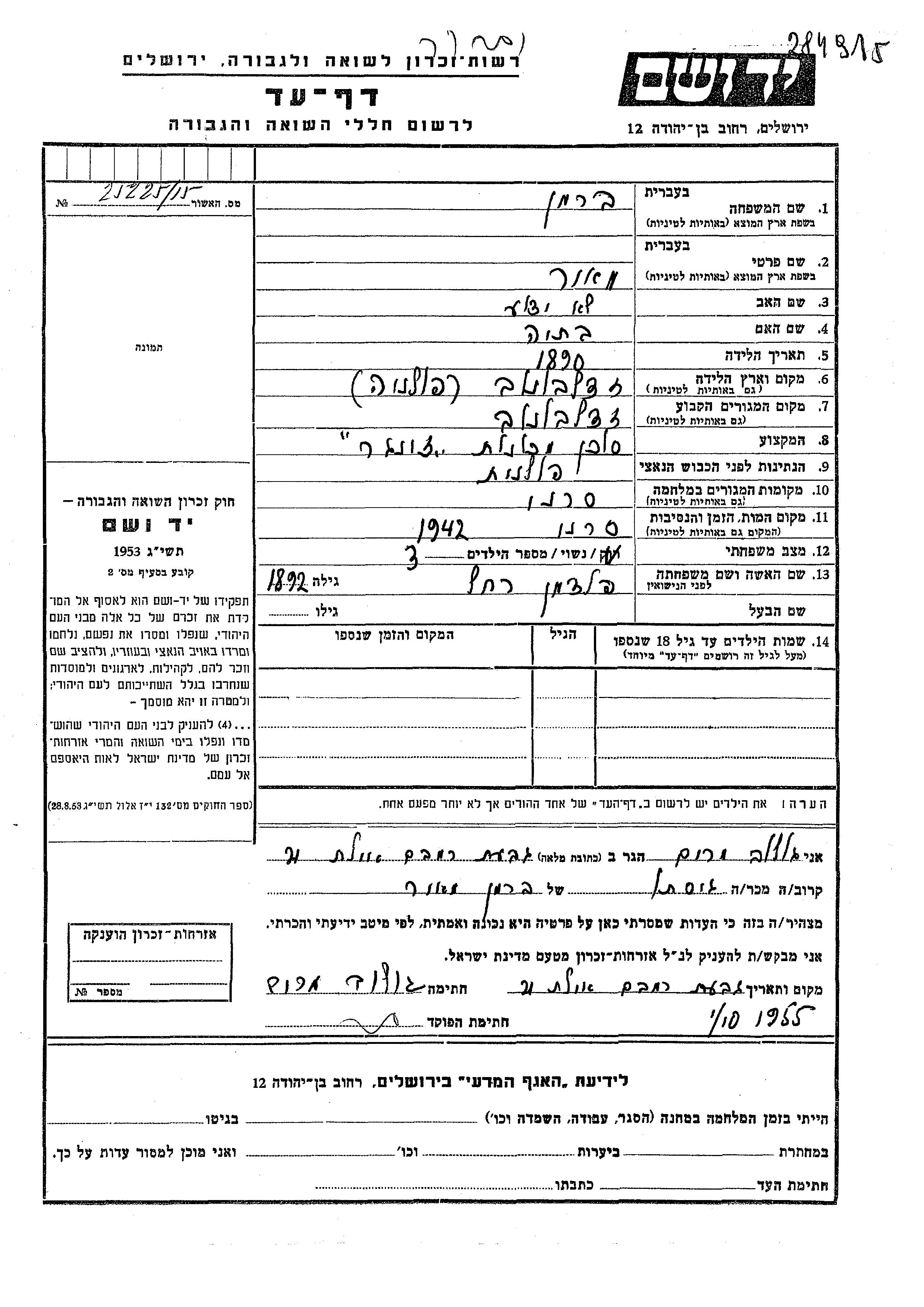 Meir Berman wurde im Jahr 1890 in Zdolbuniv, Polen geboren. Er war der Sohn von Batia. Er war Vertreter für nähmaschinen und mit Rakhel, geb. Feldman Verheiratet. Vor dem Zweiten Weltkrieg lebte er in Zdolbuniv, Polen. Während des Krieges war er in Sarny, Polen.