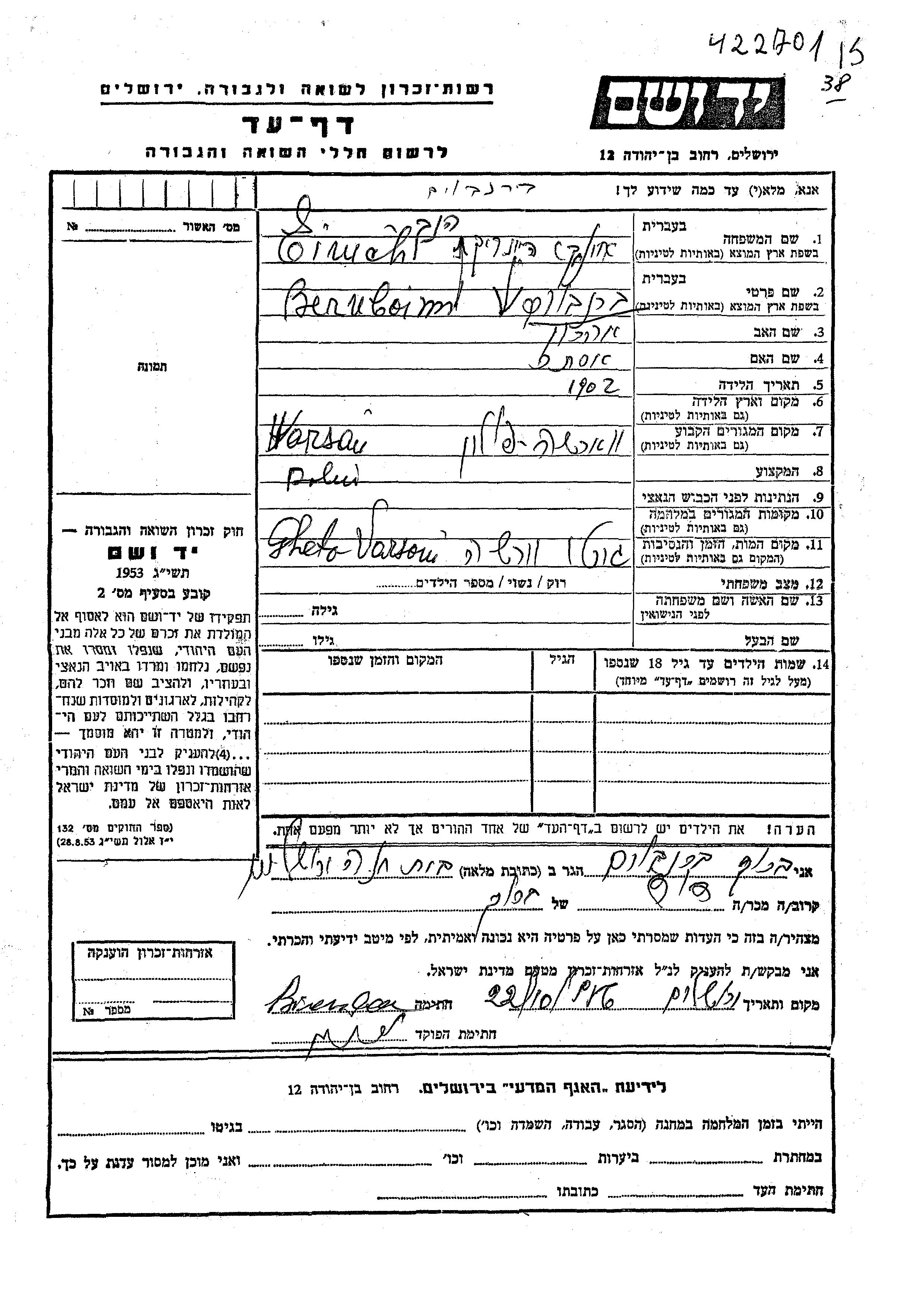 Bernboim Einich Heinrikh 1902 Warszawa, Polen Gedenkblatt