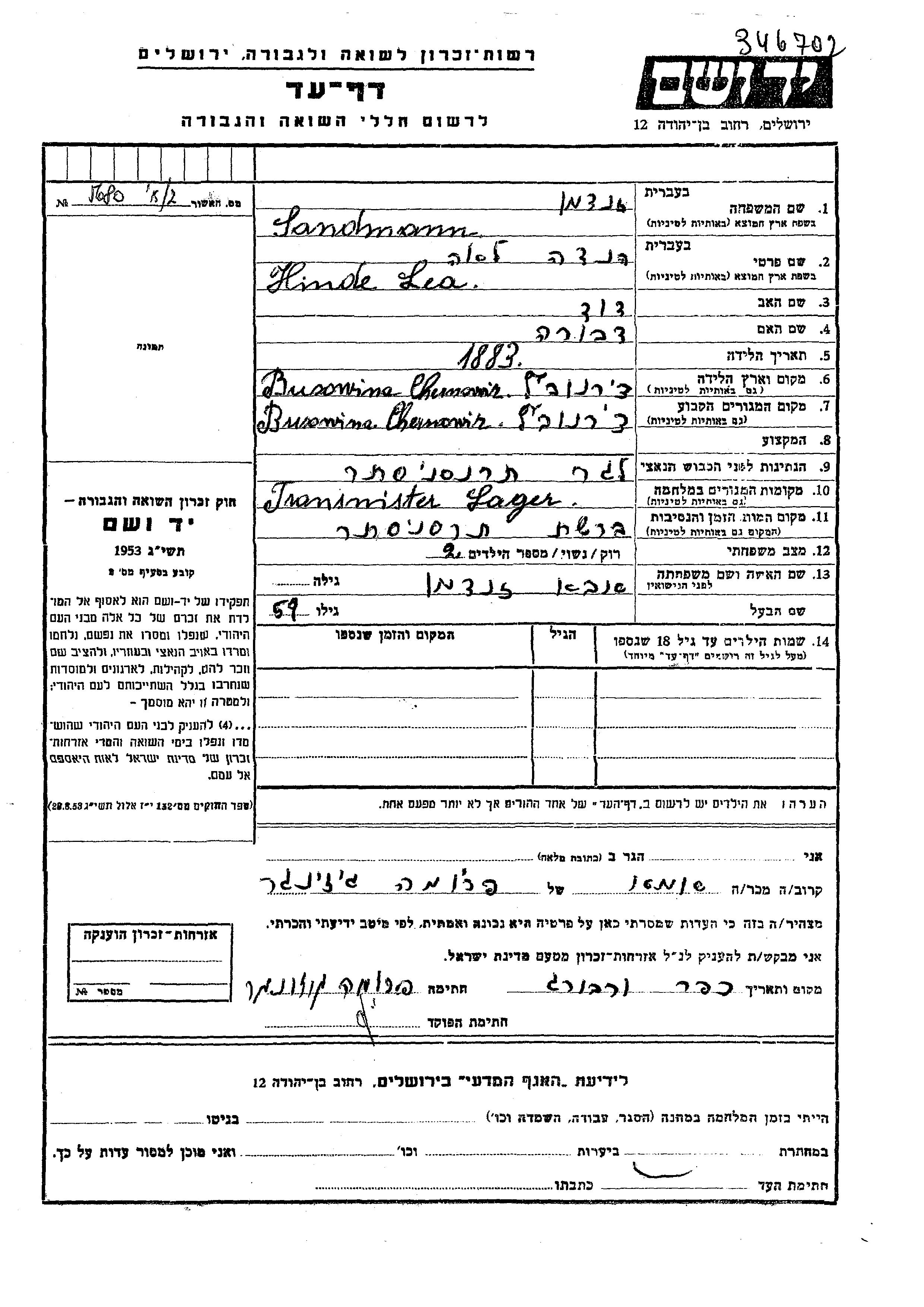 Hinde Lea Sandmann, geb. Geizinger wurde im Jahr 1883 in Chernowitz, Rumänien geboren. Sie war die Tochter von David und Dvora. Sie war mit Aba Verheiratet. Vor dem Zweiten Weltkrieg lebte sie in Chernowitz, Rumänien. Während des Krieges war sie in Transnistria, Ukraine (UdSSR).