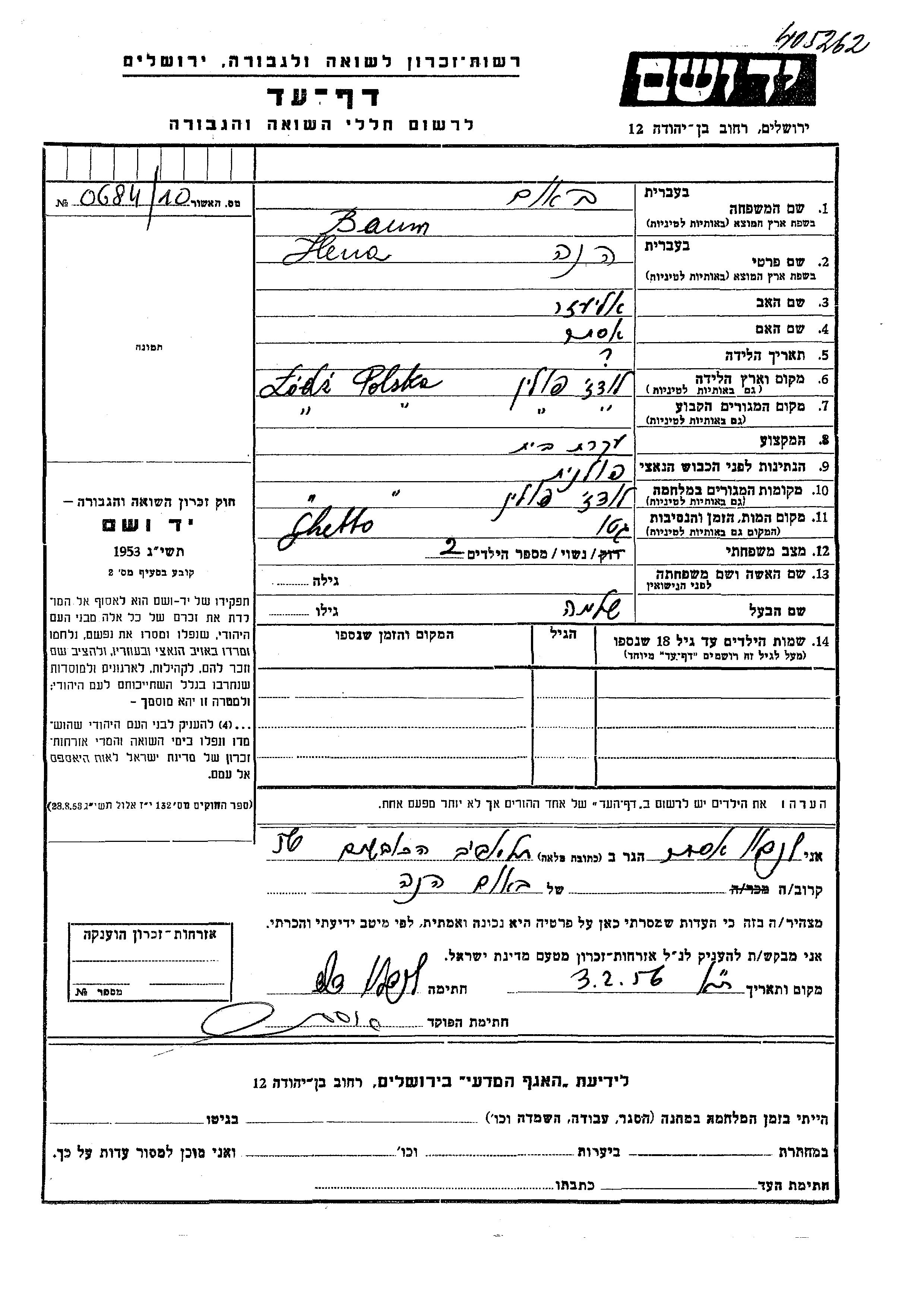 Hena Baum wurde in Lodz, Polen geboren. Sie war die Tochter von Eliezer und Ester. Sie war Hausfrau und mit Shlomo Verheiratet. Vor dem Zweiten Weltkrieg lebte sie in Lodz, Polen. Während des Krieges war sie in Lodz, Polen.