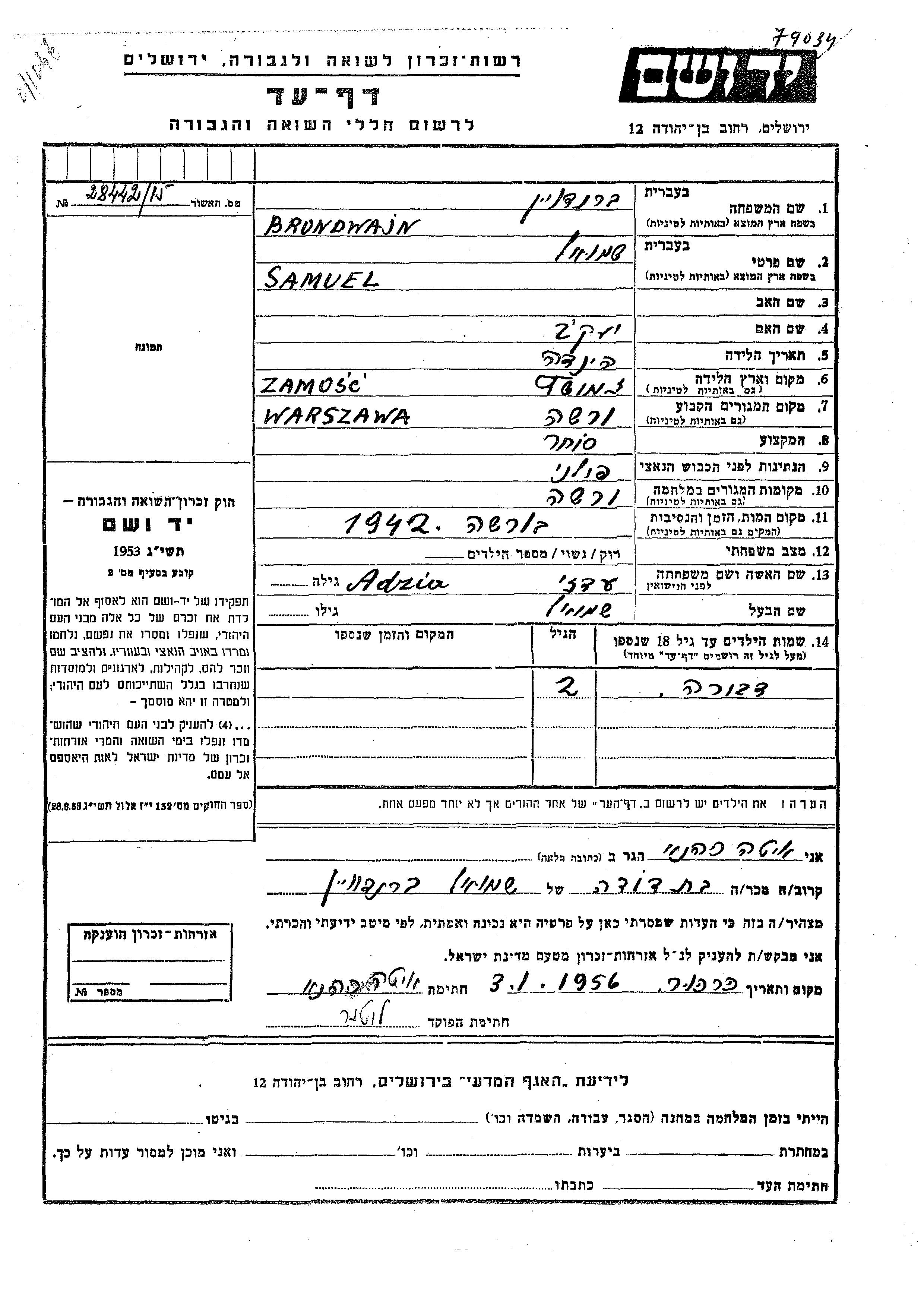 Shmuel Brondwajn wurde in Zamosc, Polen geboren. Er war der Sohn von Yaakov und Hinda. Er war Kaufmann/-frau. Vor dem Zweiten Weltkrieg lebte er in Warsaw, Polen. Während des Krieges war er in Warsaw, Polen.